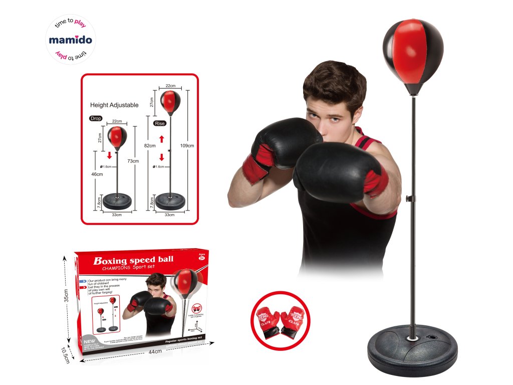 Забавният и тренировъчен боксов комплект за деца, който развива сила, ловкост и бързи рефлекси. Комплектът включва боксова круша на стойка с регулируема височина и чифт боксови ръкавици, благодарение на които децата могат безопасно да изпробват първите си удари.