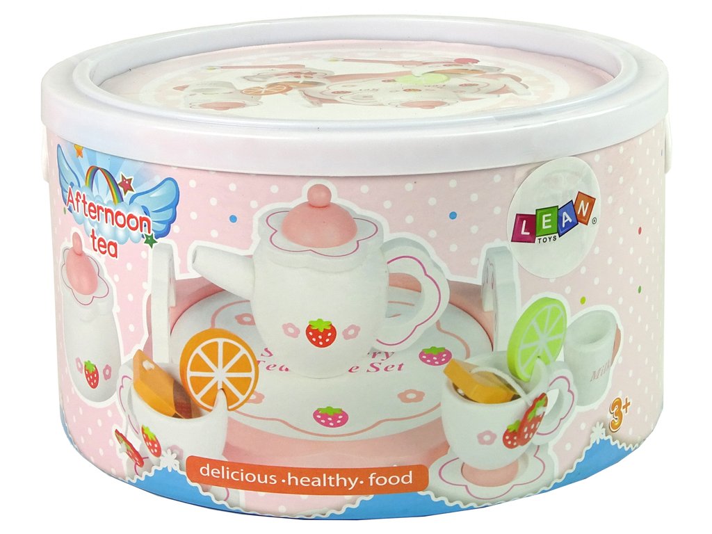 Детски дървен чай комплект розов е незаменима играчка за всяко детско чаено парти. Чайният сервиз е изработен в бяло и розово с мотиви на цветя и ягоди. Най-голямото предимство е, че комплектът е изработен от дърво, което гарантира по-голяма безопасност и комфорт при игра, както и по-дълъг живот на играчката. Този комплект развива креативността, фината моторика и логическото мислене при децата и същевременно осигурява много забавление.