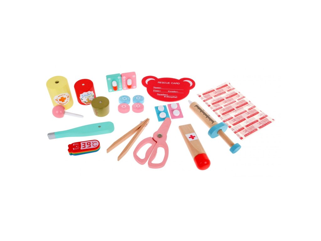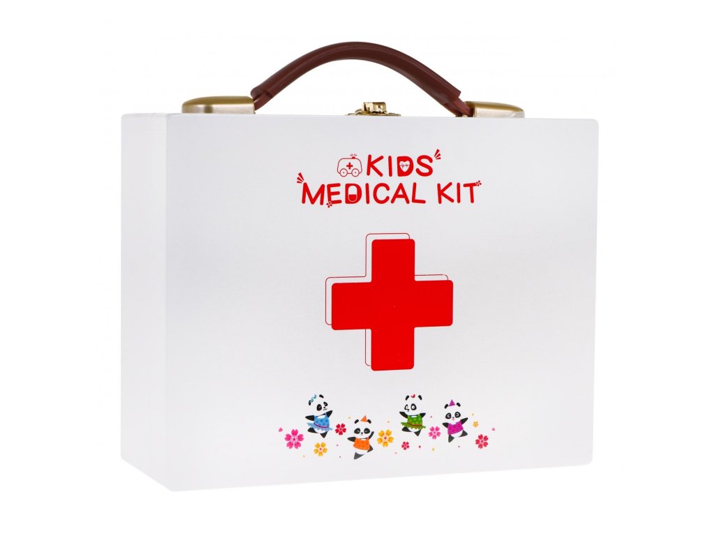 Детски дървен медицински комплект е незаменим в много спешни ситуации. Добре оборудваната медицинска кутия е полезна при лечението на плюшени мечета, кукли и членове на семейството. Играта с този комплект осигурява много забавление и помага на детето да преодолее страха от посещението при лекаря. Цветните медицински аксесоари са изработени от дърво. Всичко е опаковано в дървена кутия с удобна дръжка.