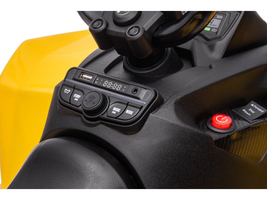 Сред оборудването е музикален панел с входове USB, MP3, Радио и Bluetooth. Четворката Can-Am има предни и задни светлини, позволява шофиране във всички посоки и товароносимостта ѝ е до 30 кг.