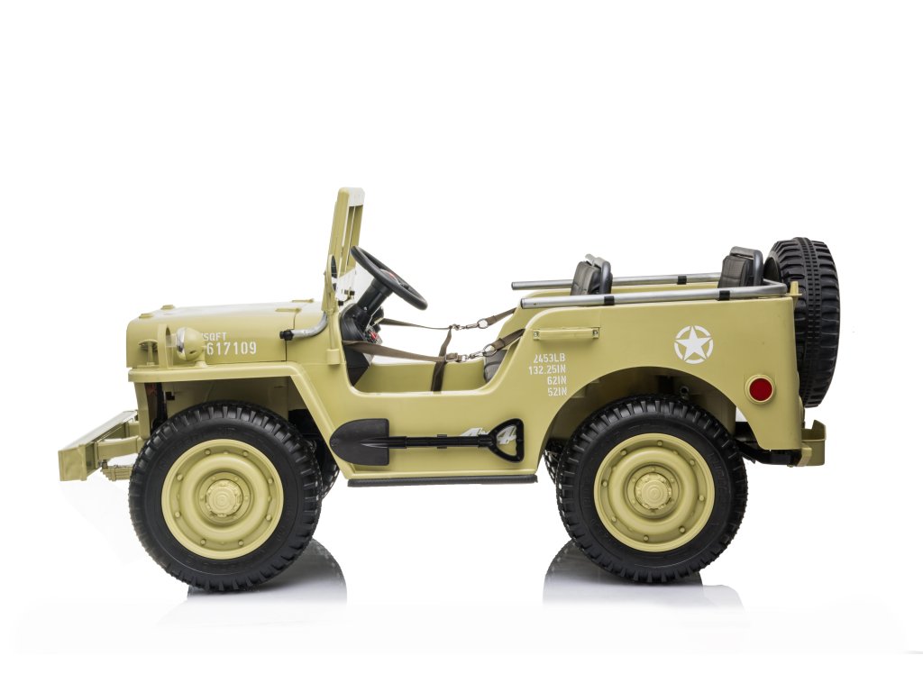 Детско военно електрическо бъги благодарение на EVA пяна гуми се адаптира към различни видове повърхности. Благодарение на задвижването на четирите колела, детето може да излезе извън пътя. Военната кола има товароносимост до 60 кг, така че детето може да вози приятел или брат. Пътуването със сигурност ще бъде по-приятно със звукови и светлинни ефекти. На музикалния панел можете да използвате USB и SD вход, MP3 връзка или Bluetooth.
