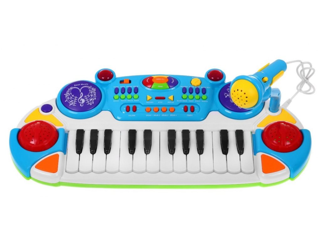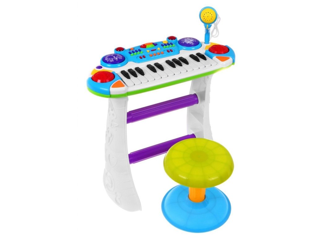 Детски електрически клавиатура със столче синьо е отлично предложение за всички малки музикални почитатели, както и за начинаещи. Разполага с 14 бели и 10 черни клавиша. Освен това включва стойка с микрофон и детско столче, адаптирано за най-малките.