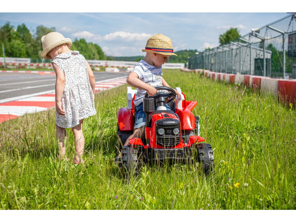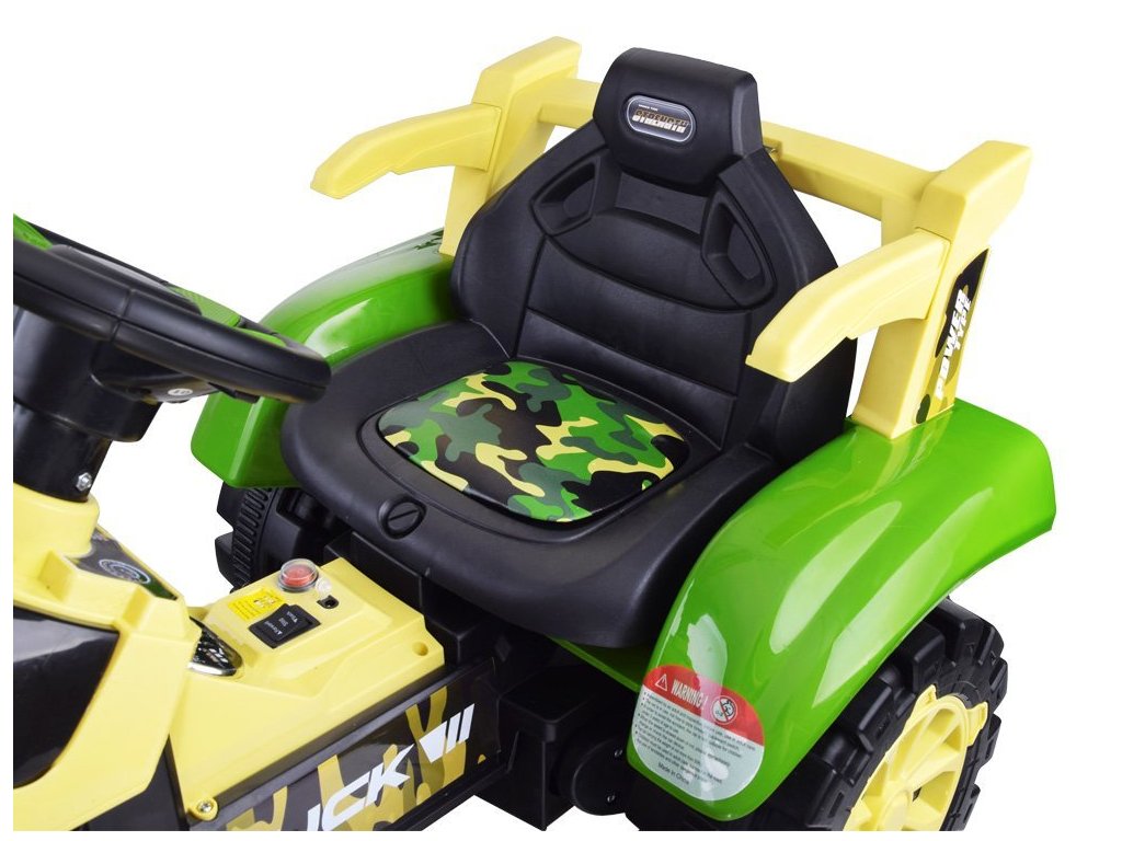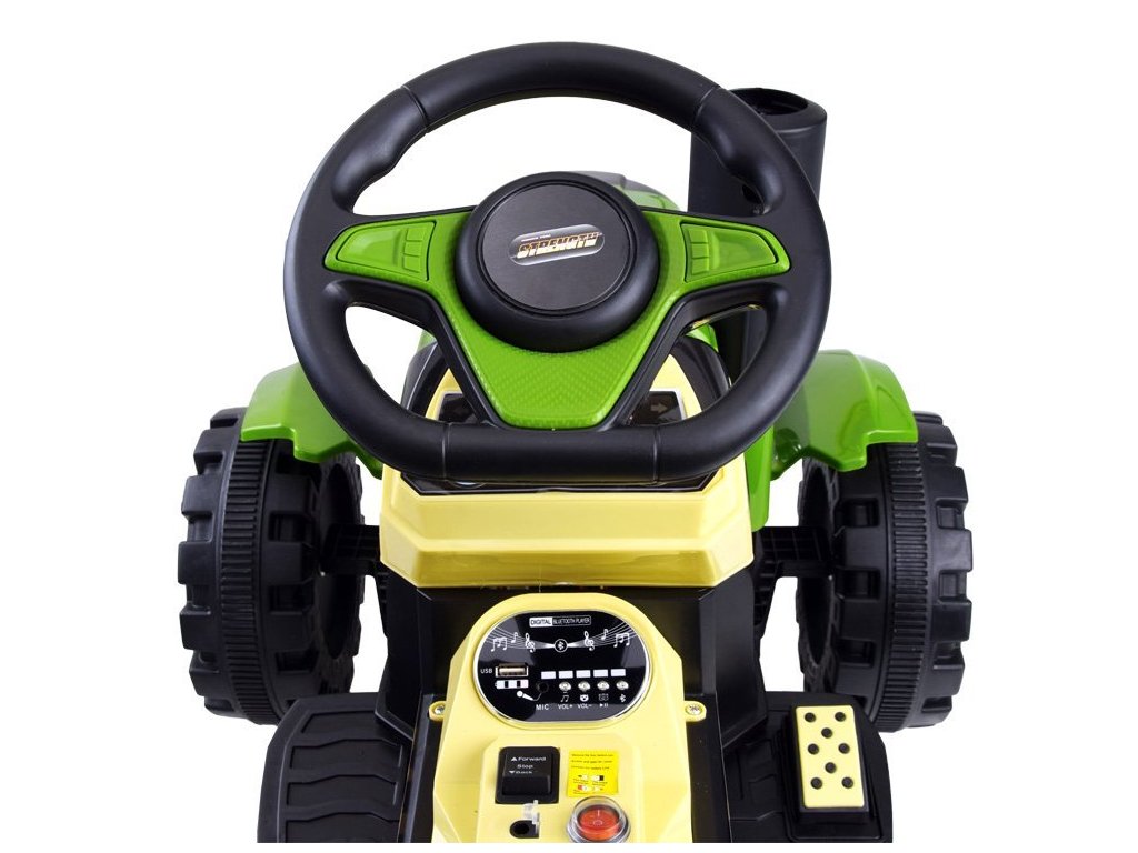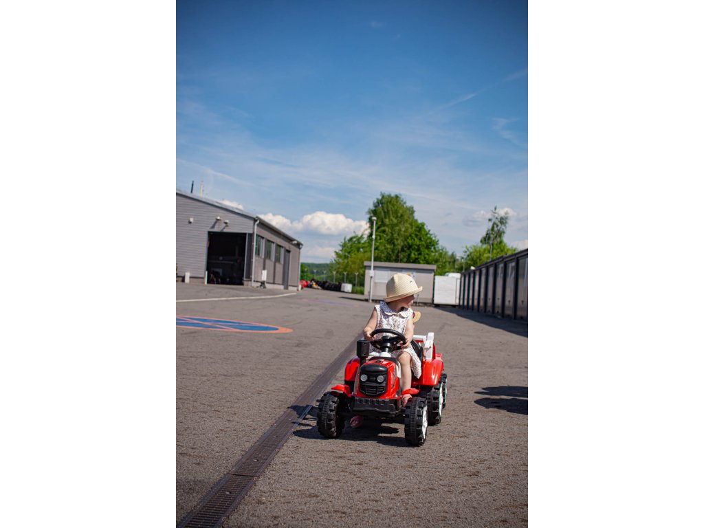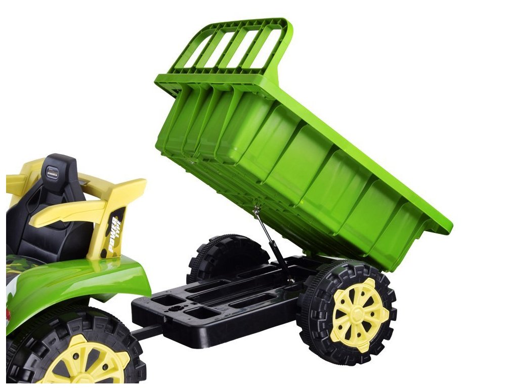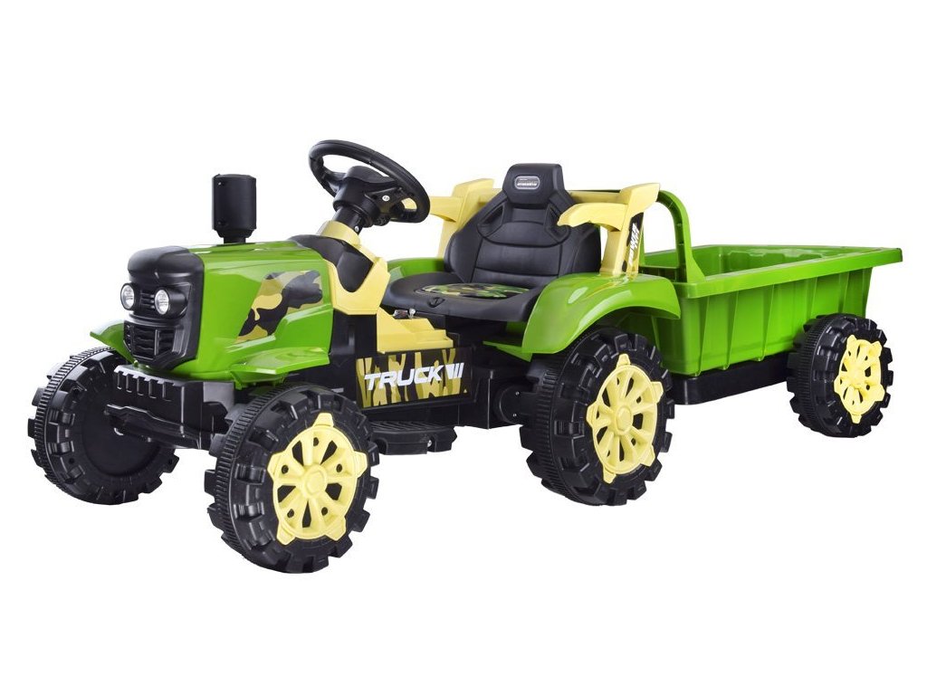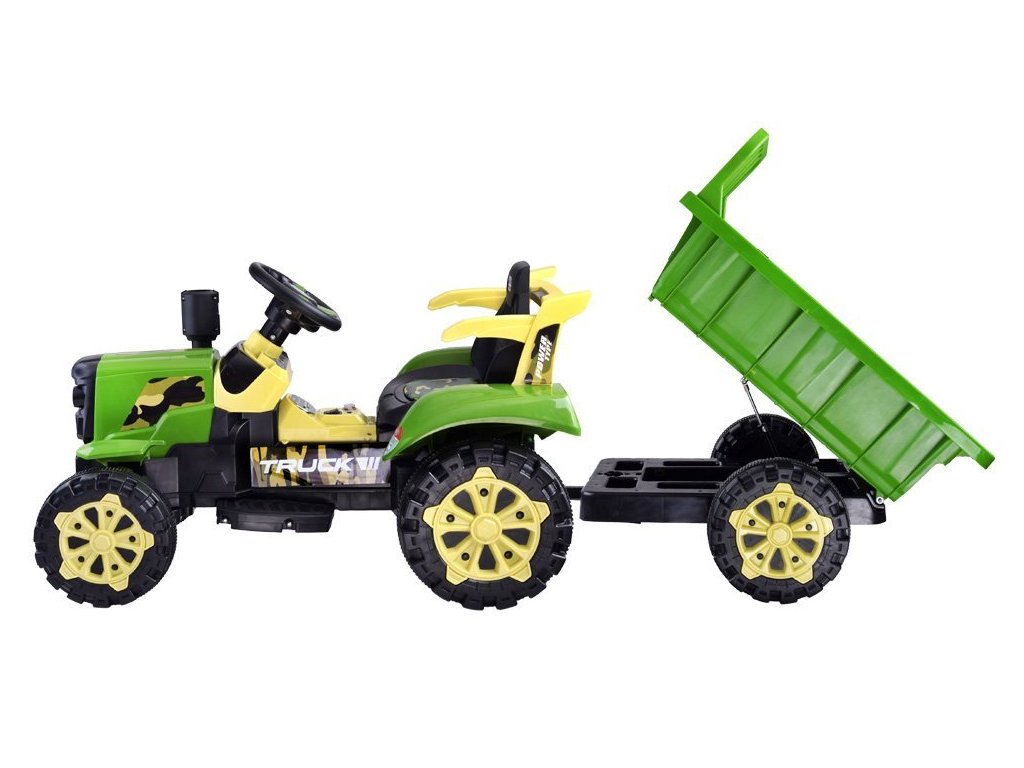 Електрическият трактор с ремарке ще осигури много забавление на всеки малък фермер. Тракторът с ремарке със светлинни и звукови ефекти е чудесно допълнение за игра в градината или на детската площадка. Сега малкият шофьор на трактора може да ви помогне с пренасянето на сухи клони или листа. Тракторът се задвижва от 2 мотора 2 x 6V + 1 гелова батерия 6V 7Ah.