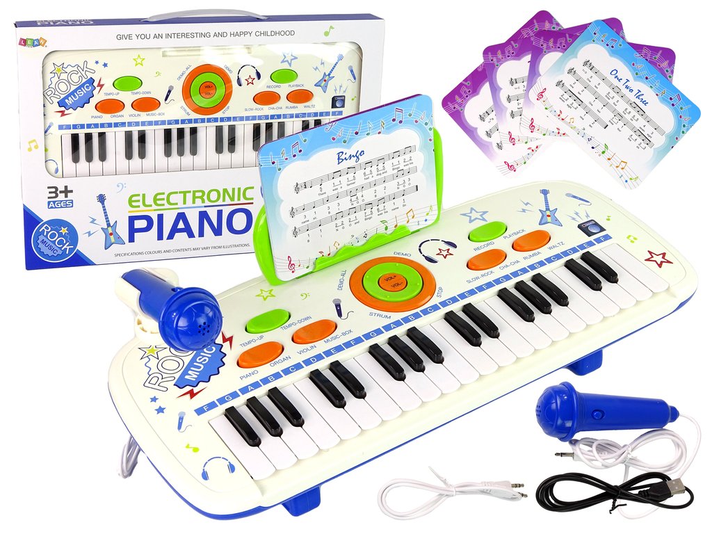Детски електронен клавиатура с микрофон и ноти е отличен избор за малките музикални ентусиасти, както и за начинаещите. Разполага с 22 бели клавиша и 15 черни клавиша. Има стойка за ноти и микрофон.