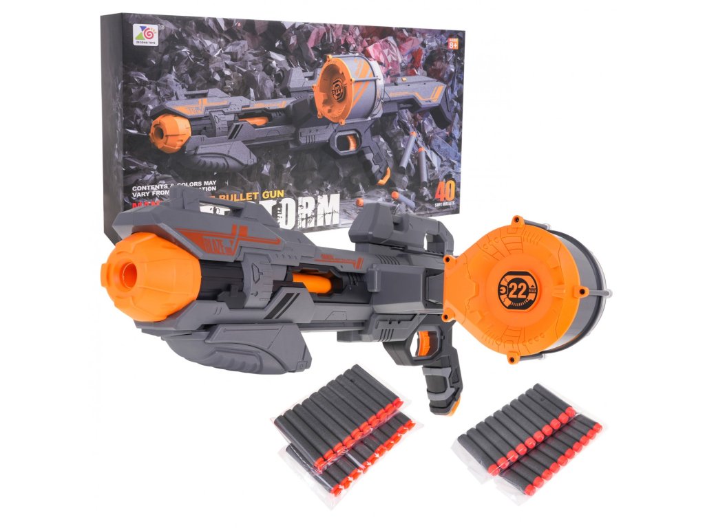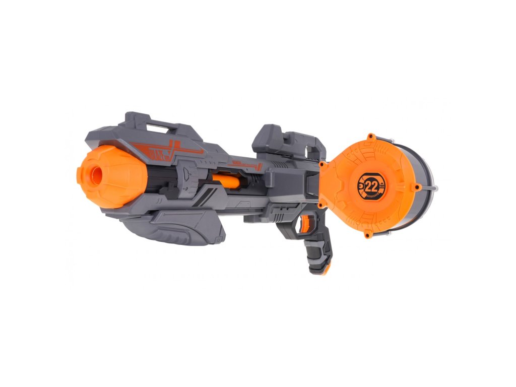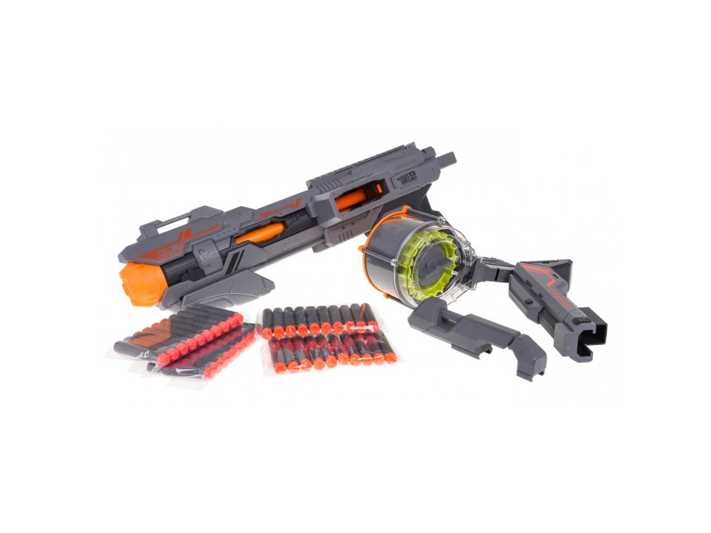 Детски голям пистолет за пяна снаряди Blaze Storm сив разполага с пълнител, който събира до 22 снаряда. След като пълнителят се зареди, трябва ръчно да се опъне пружинният механизъм и да се натисне спусъкът. Пистолетът има приклад, който може да бъде свален.