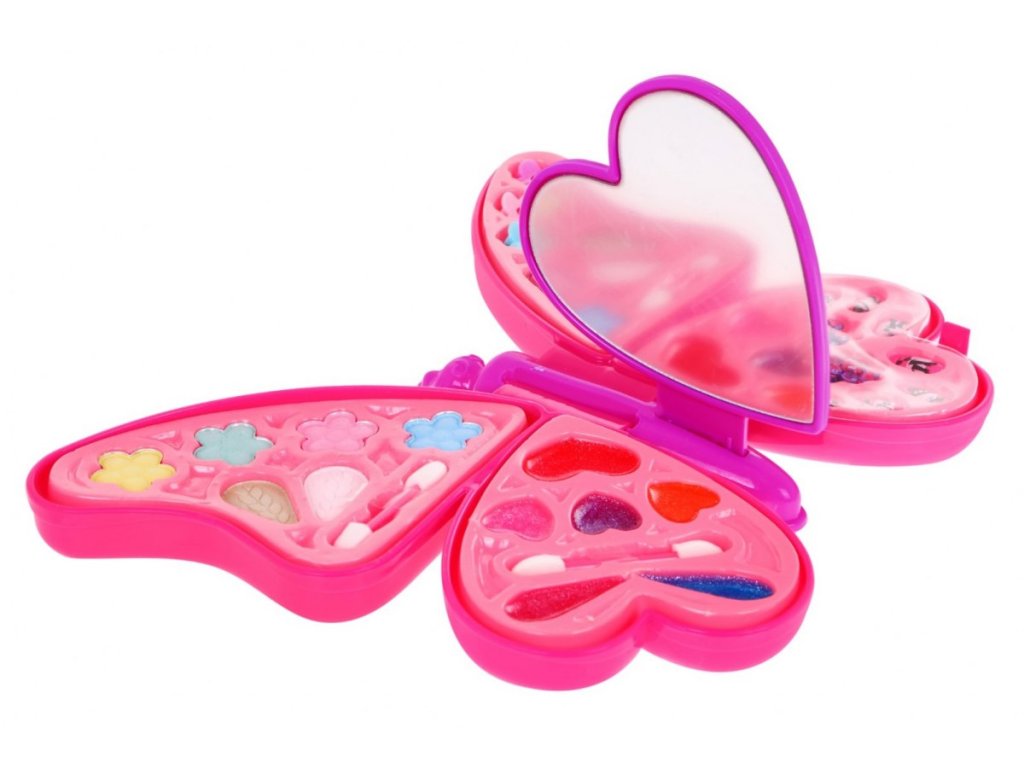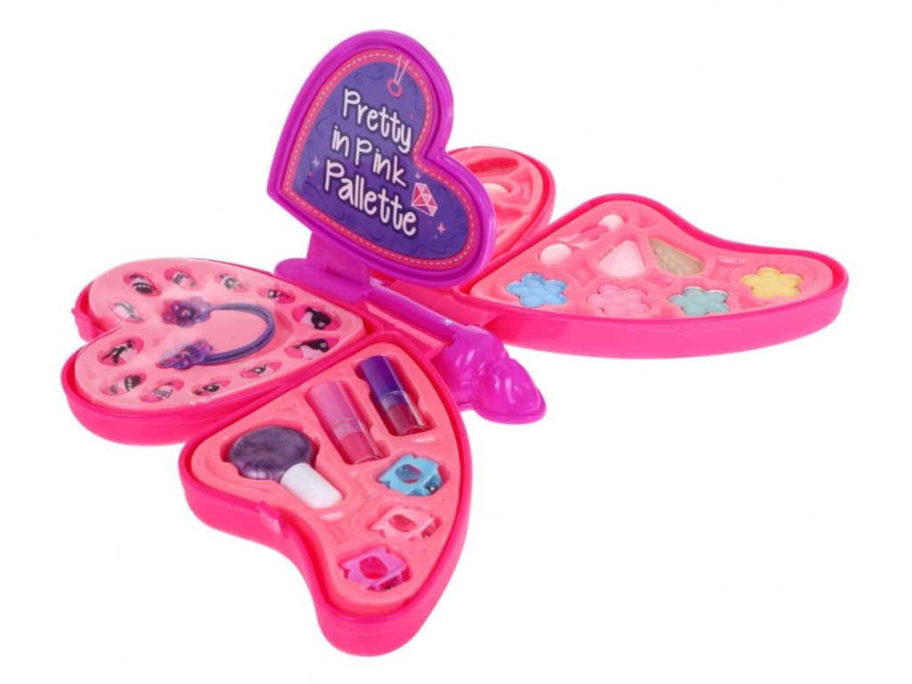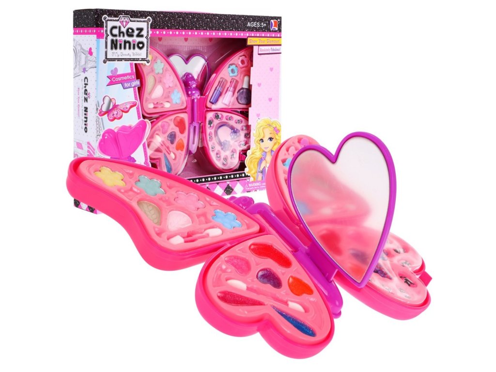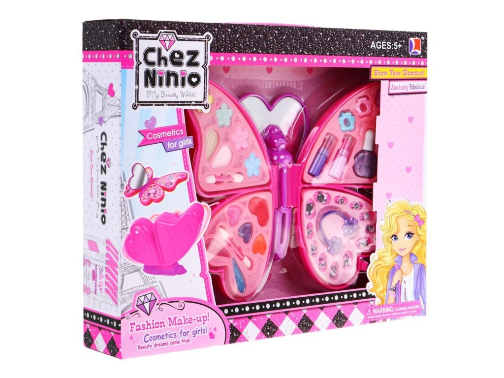 Богато оборудван комплект козметика в практична затваряща се кутия с формата на пеперуда. Комплектът включва много козметични продукти като: сенки за очи, четки, блестящи балсами за устни, червила, лакове за нокти, фиби за коса и ластичета за коса. Кутията с детска козметика може да се затвори след игра, за да се спести място.