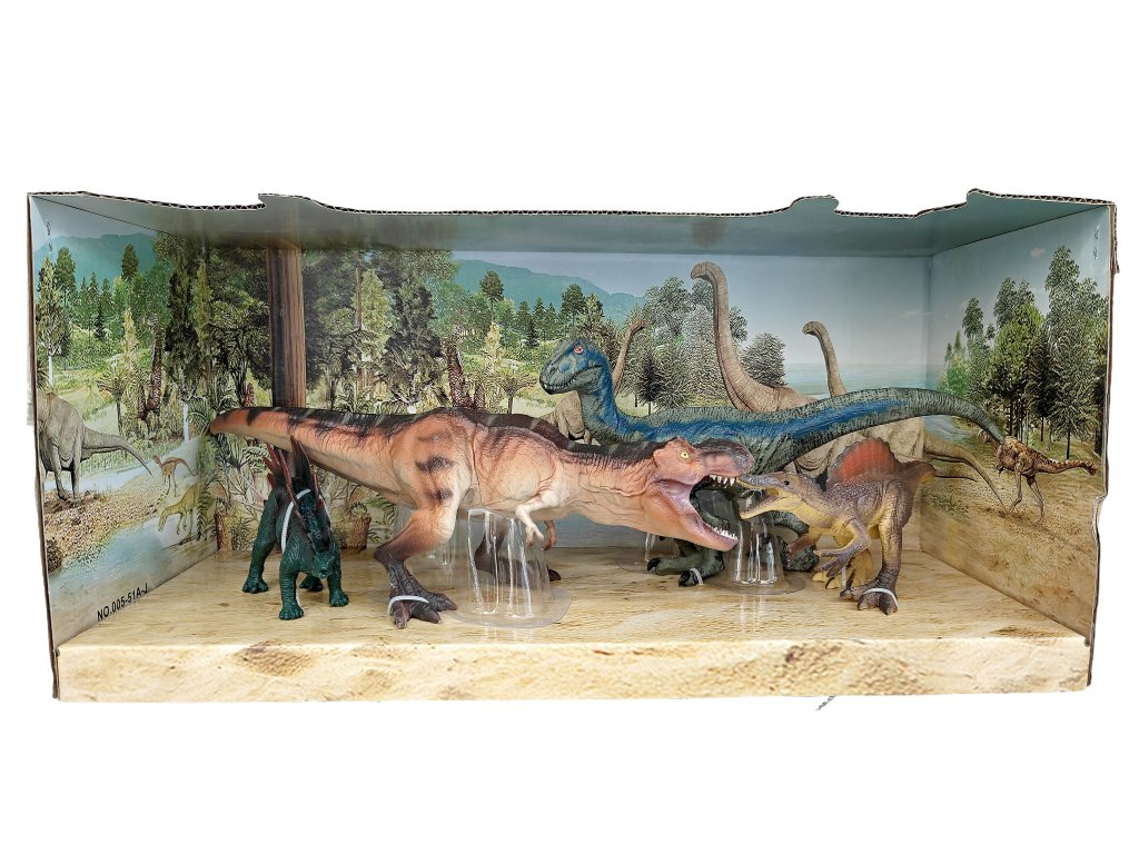Всеки динозавър има сложна текстура на кожата, ярки цветове и динамична поза, което го прави да изглежда жив и привлекателен. Големите фигурки са достатъчно здрави, за да издържат на интензивна игра, като същевременно са леки за лесно хващане. Комплектът е опакован във впечатляваща панорамна опаковка с праисторически пейзаж, която подсилва преживяването.