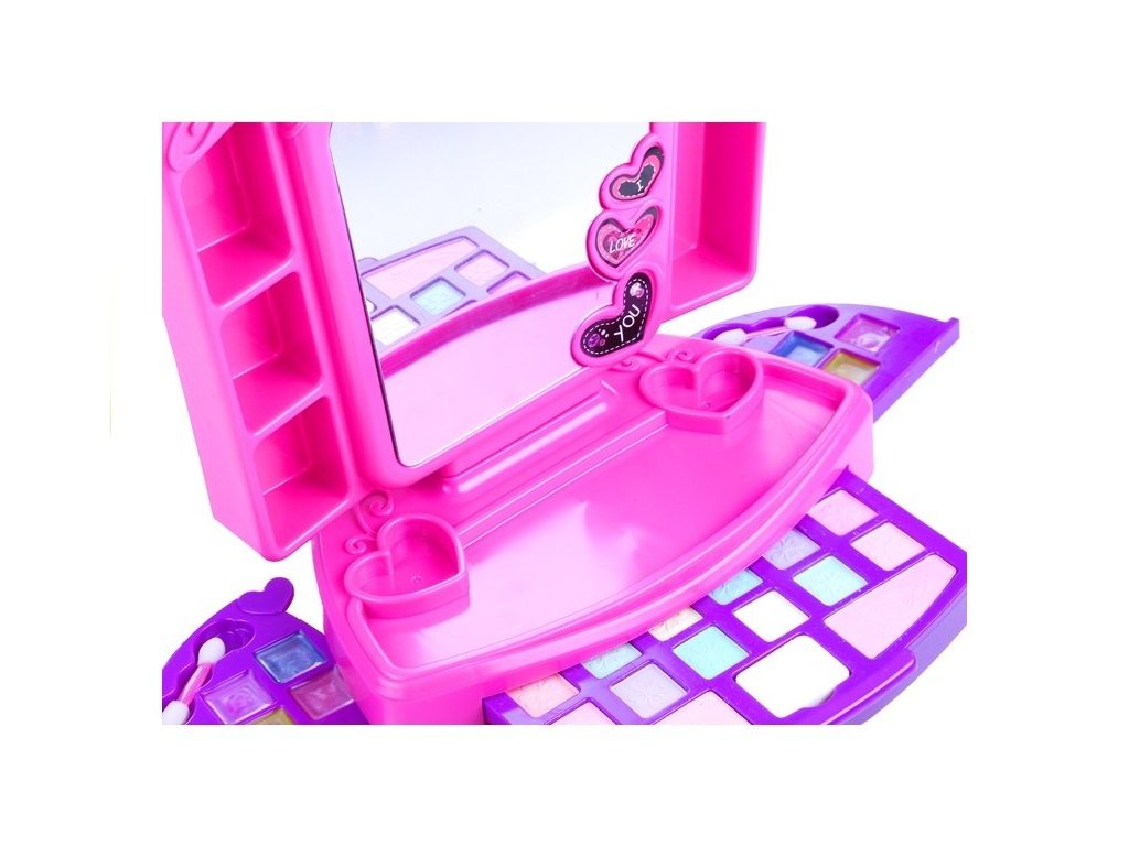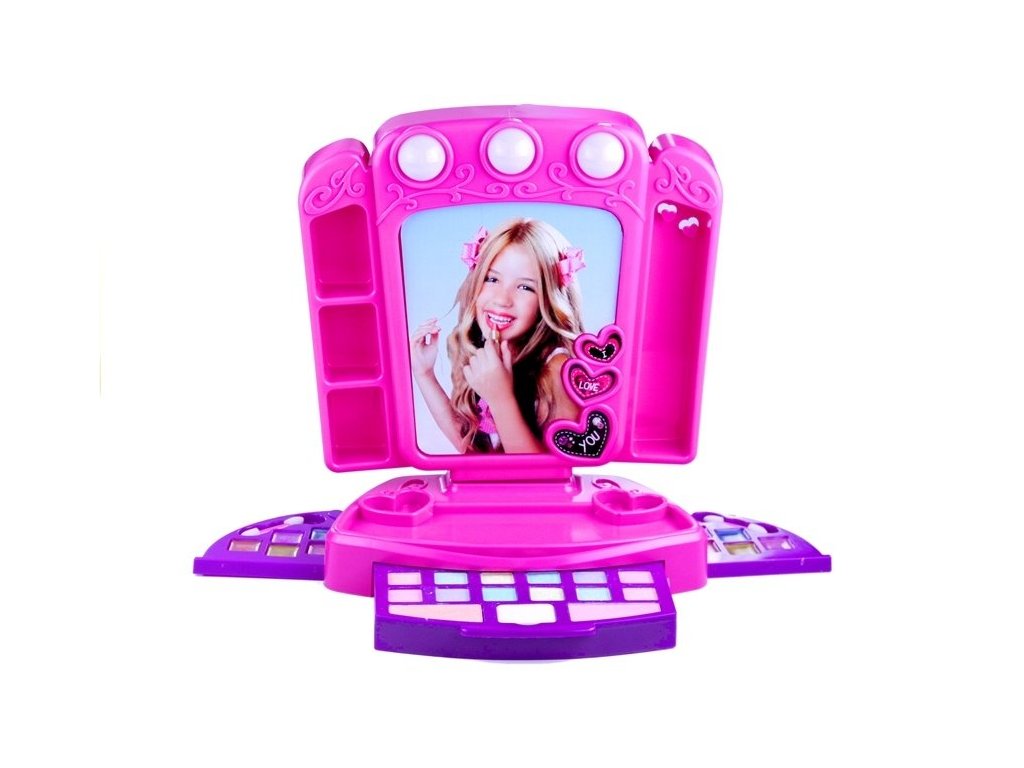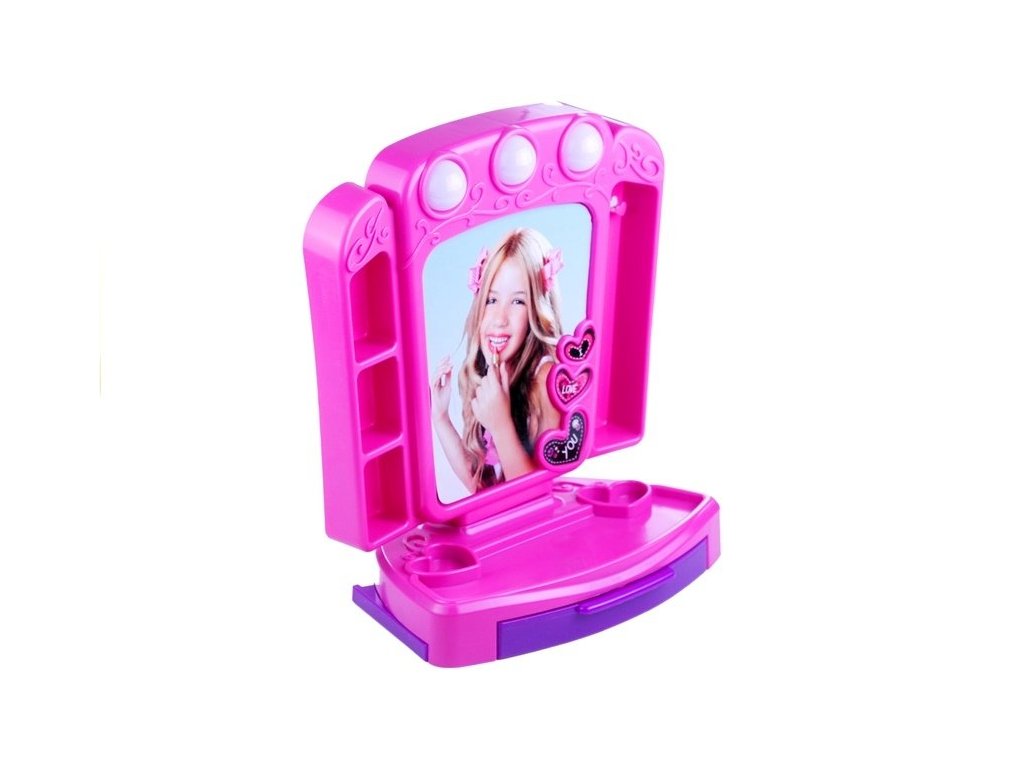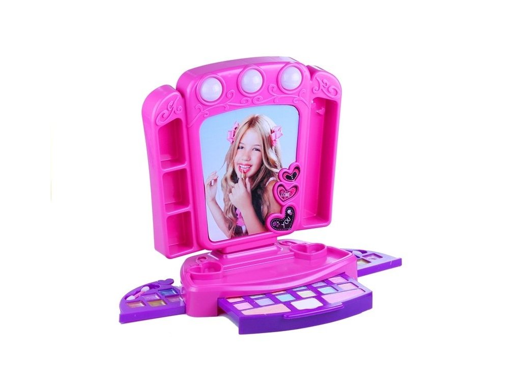 Детски комплект гримове с огледалце, идеален за всяка детска стая. Над огледалцето има 3 светлинки, а отстрани са разположени малки отделения за съхранение на дреболии.