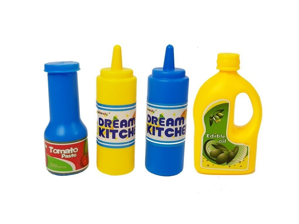 В комплекта ще намерите електрическа плочка, тиган, тенджери, капаци, електрическа кана и хранителни продукти – наденица, яйца, царевица, ягоди, гъба, морков, лимон, ядка, кетчуп, олио и 2 бутилки за сосове.