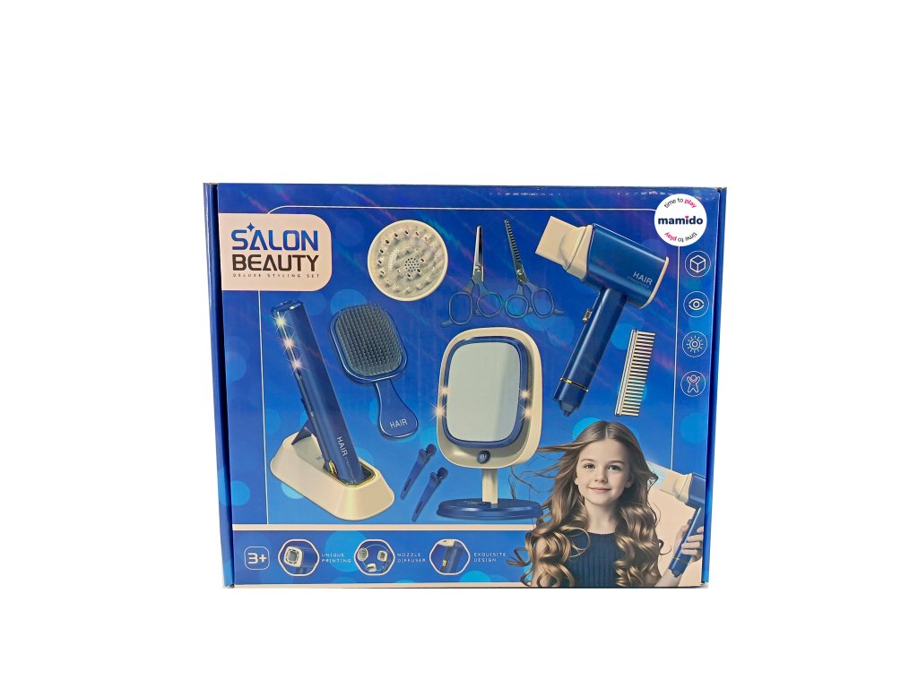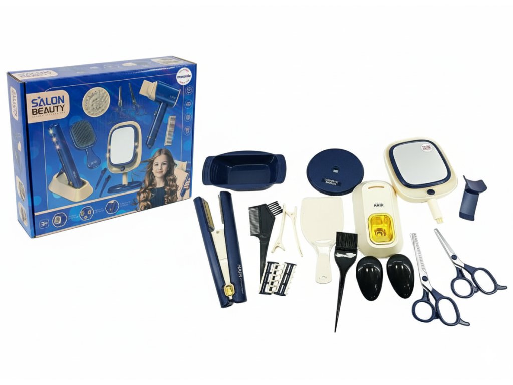 Всяка малка фризьорка ще хареса този богато оборудван фризьорски комплект с 17 елемента, който ще превърне детската стая в истински салон за красота. Комплектът включва ножици, гребени, преса за коса, четка и практично козметично огледало. Децата така могат да изпробват различни прически и да имитират фризьорската работа по забавен и безопасен начин.