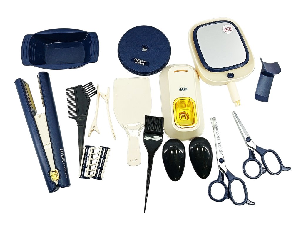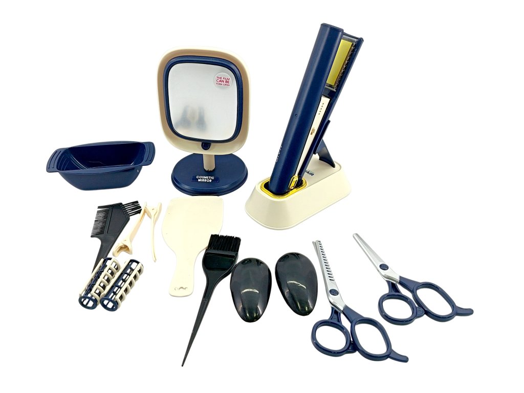 - Съдържание: преса за коса, сешоар, гребени, четка, ножици, ролки, фиби, купа, козметично огледало и други аксесоари