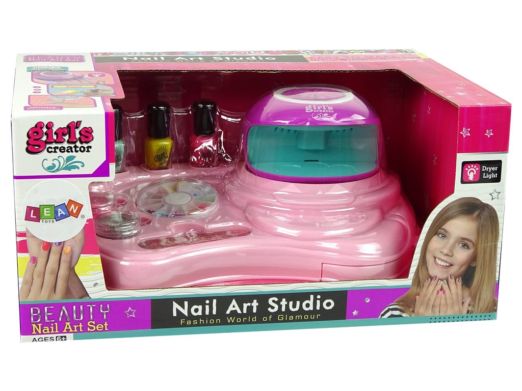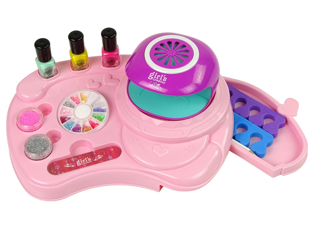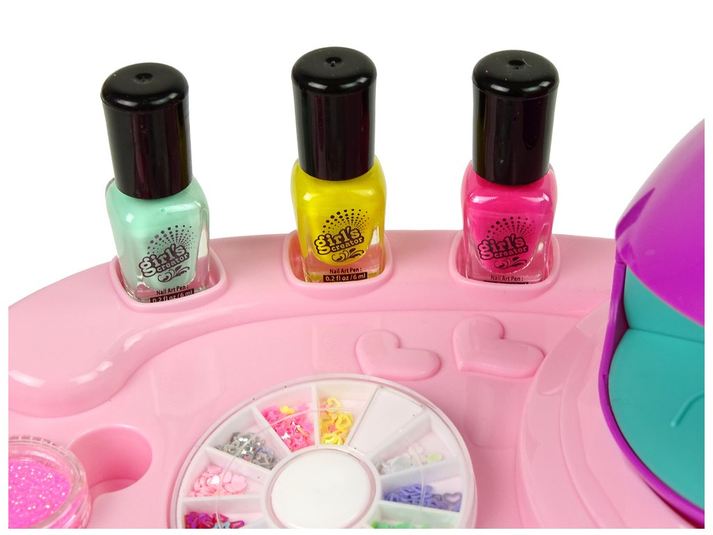 Детски комплект за лакиране на нокти с брокат завладява сърцата на всички момичета с цветните лакове за нокти и броката, включен в комплекта, както и сушилката за нокти. Модните цветове и стикерите позволяват създаването на страхотен маникюр, който се премахва бързо и без увреждане – благодарение на специалния принцип с лепенки.
