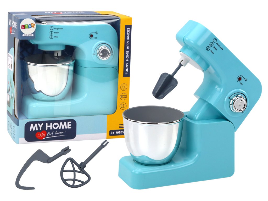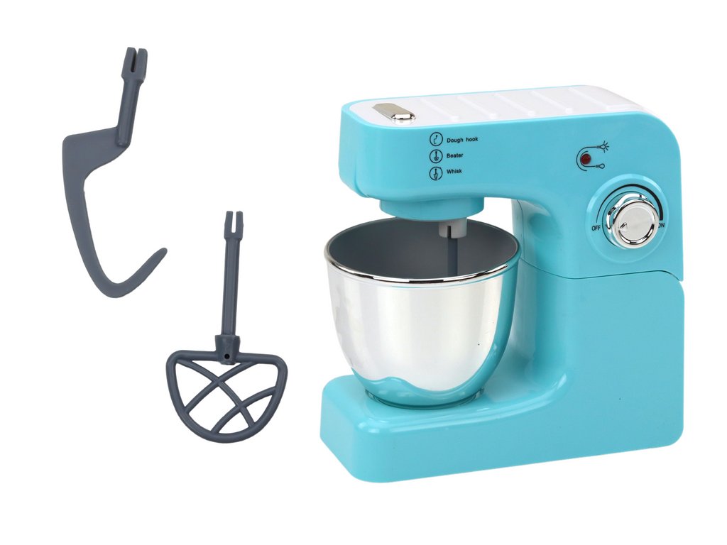 Детски кухненски робот с 3 приставки тюркоазен е чудесна играчка и помощник за малките готвачи. Оборудван е с три приставки за разбиване и месене на тесто, което позволява на децата да експериментират с различни рецепти. В комплекта е включена и удобна купа за лесно разбъркване.