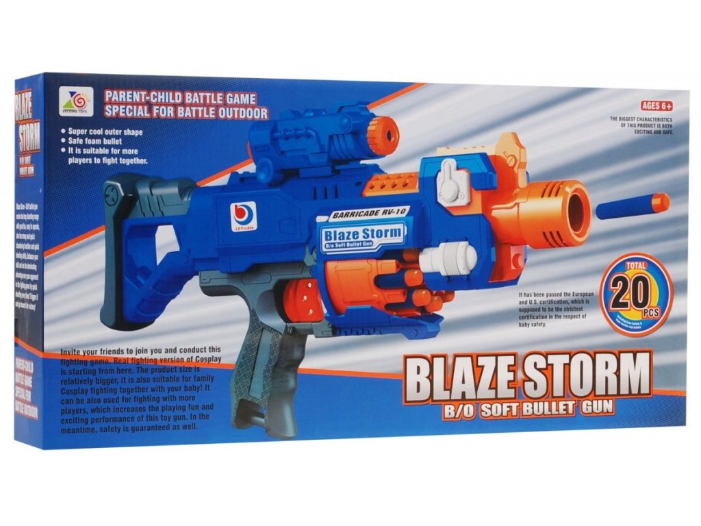 Изключително бърз и точен Детски пистолет Blaze Storm автомат, който се зарежда с 10 меки пяна стрелички, които не нараняват никого. Те са меки и тъпоконечни, така че няма риск от нараняване. Пистолетът се зарежда отпред и стреля до 3 стрелички в секунда. Устройството може да изстрелва на разстояние до 10 метра. Пистолетът е лек, удобен за държане и устойчив. С този пистолет няма да ви е скучно – организирайте весел стрелкови двубой у дома, сигурно и татковците ще се включат и ще се върнат към детските си години заедно със своите синове.