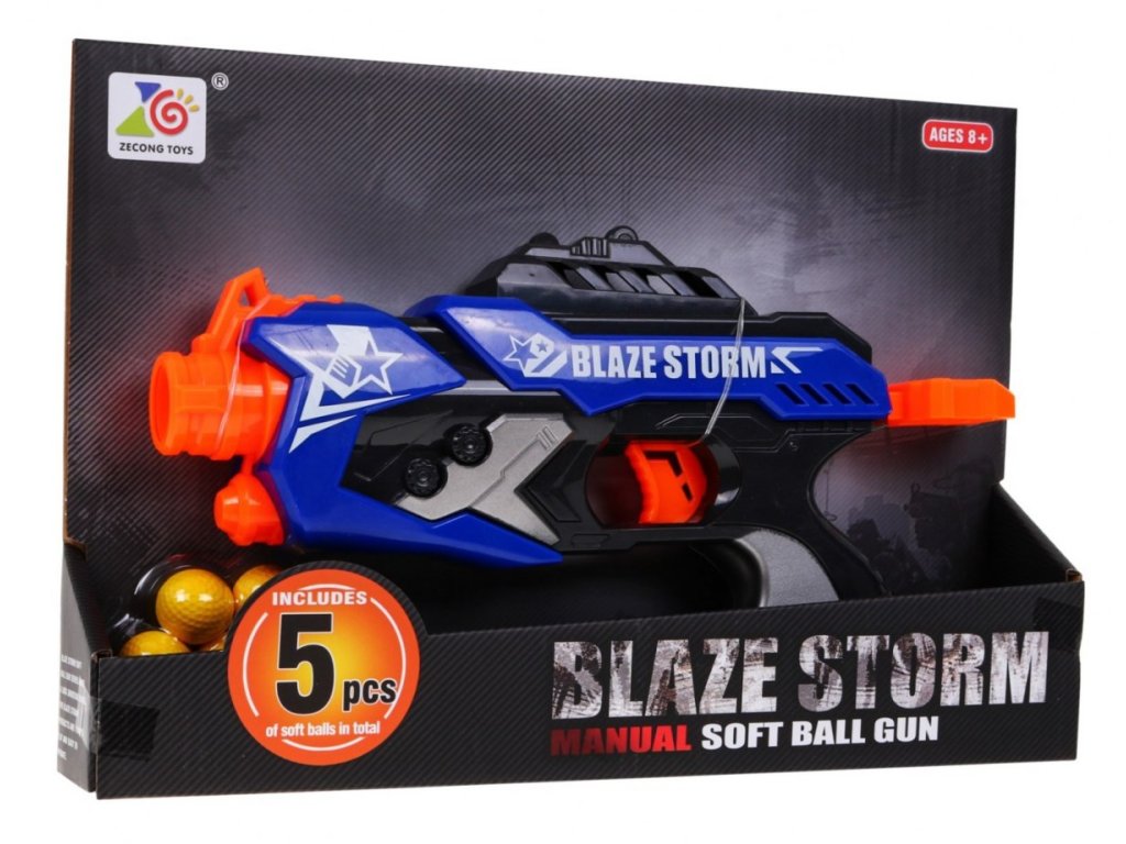 Поставете топче в цевта, задвижете механизма и натиснете спусъка. Детският пистолет Blaze Storm за топчета изстрелва меки пяна топчета на дълги разстояния. В горната част на оръжието има място за съхранение на 3 топчета.