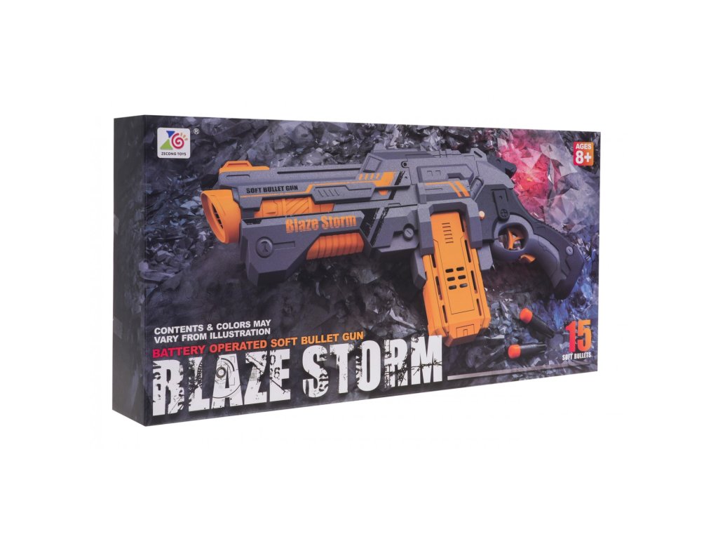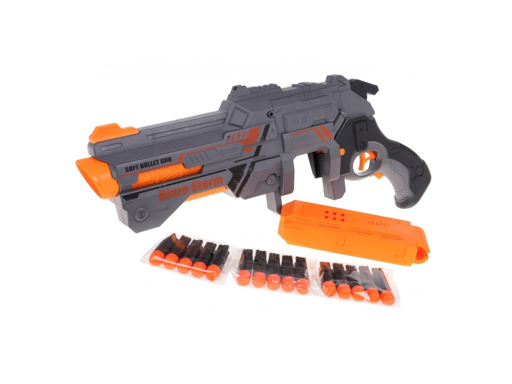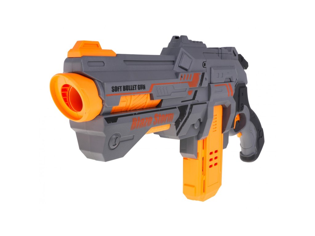 Полуавтоматичен детски пистолет с капацитет за меки снопове, лесен за използване – просто заредете магазина, натиснете и задръжте бутона за захранване, прицелете и натиснете спусъка. Играчката работи с 4 броя AA батерии 1,5 V, които не са включени в комплекта.