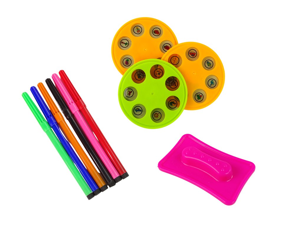 С помощта на проектора може да се копират изображения от включените шаблони, проектират върху стена и най-вече детето може да създава свои собствени, уникални творби. Комплектът съдържа 21 интересни шаблона разположени на три заоблени диска, шест броя Magic маркери и лъжичка за измиване на рисунките.