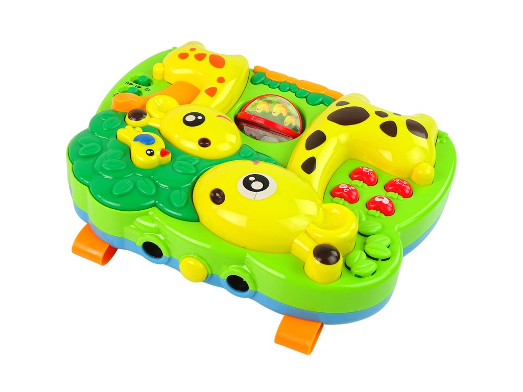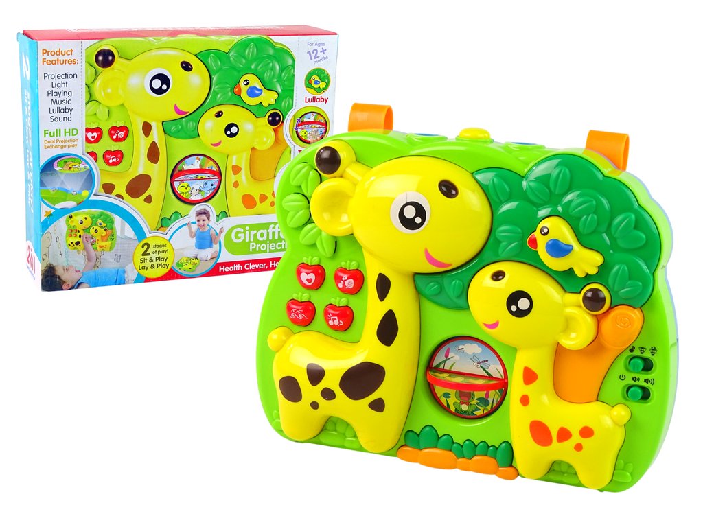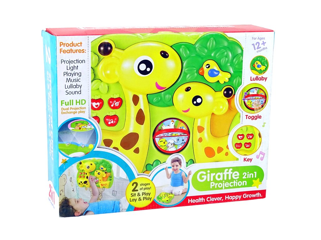 Детски проектор Жираф 2в1 е прекрасен декоративен елемент за детската стая и надежден помощник при успокояването и приспиването на бебето – музикална кутия, която свири нежни мелодии, придружени от приглушена светлина, излъчвана от фигурките, както и от образи, проектирани на тавана.