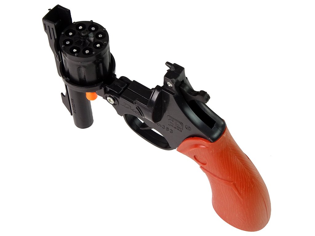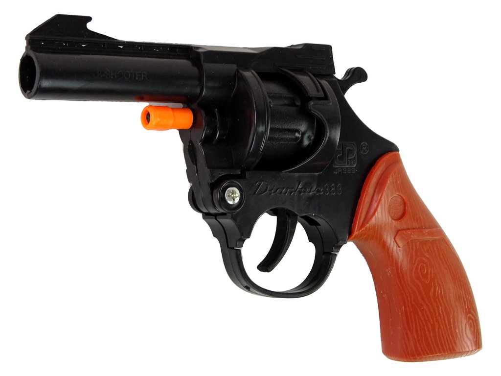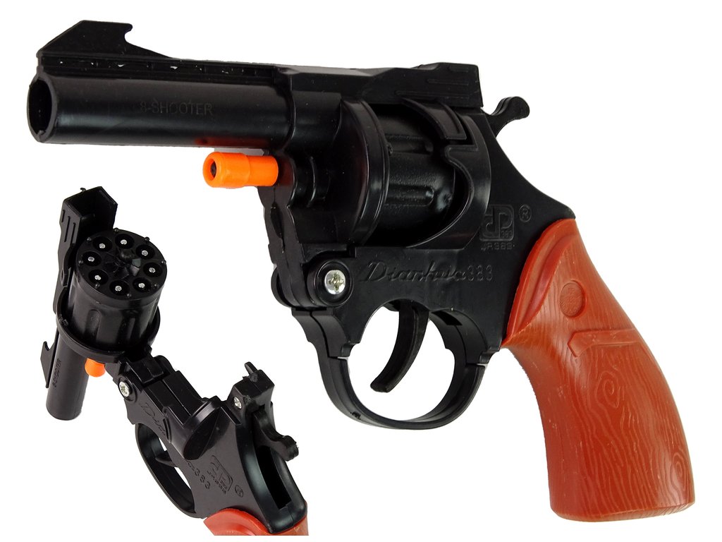 Револверът използва тапички за пукане, които позволяват стрелба без необходимост от истински боеприпаси. Това го прави напълно безопасен за вашето дете и околната среда. Оръжието е лесно за употреба, така че детето ви бързо ще се научи да стреля първите шумни изстрели. Пластмасовият барабан се отваря с помощта на оранжев предпазител, в който има място за 8 патрона.