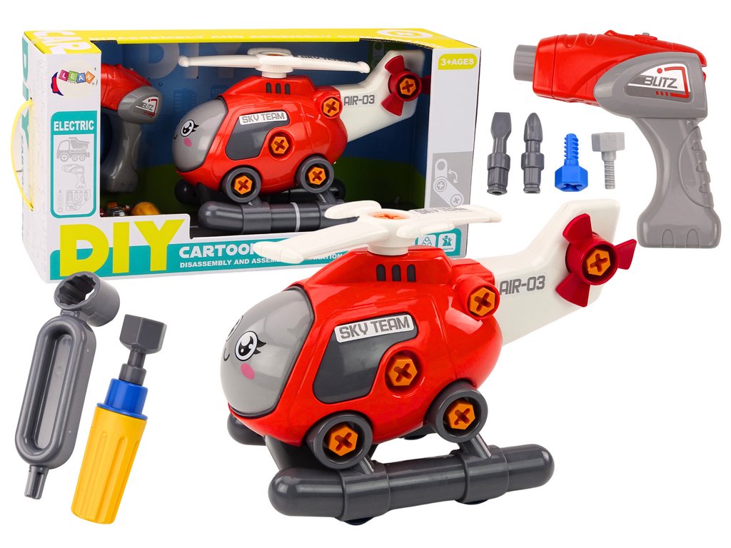 Играта включва и комплект инструменти – винтоверт, отвертка, гаечен ключ и три сменяеми накрайника. Те са проектирани специално за малки детски ръчички, което позволява на децата да разглобяват и сглобяват хеликоптера безопасно и лесно. Това е отлична възможност за децата да се почувстват като истински механици и да развият фината моторика и координацията око-ръка.