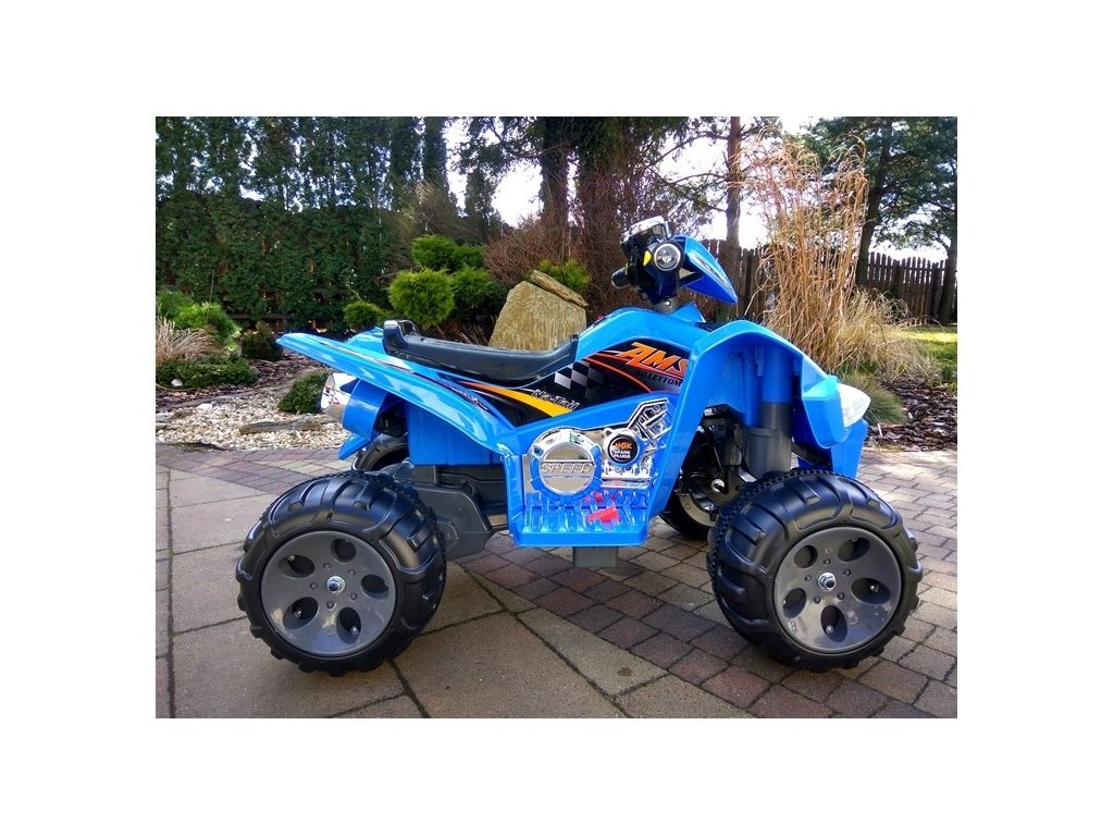 Детско акумулаторно атв AMS синьо е предназначено за деца от 3 години. Разполага с функция за автоматично спиране, която се активира веднага щом кракът се премахне от педала за газ.