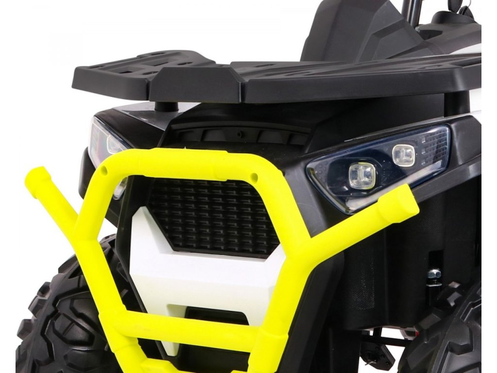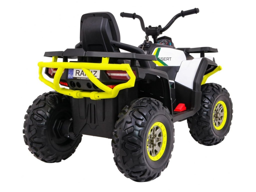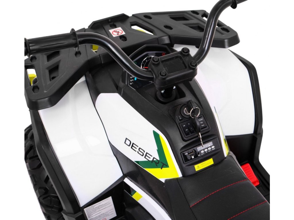 Сред оборудването е включен музикален панел с входове за MP3, SD, AUX, USB и предварително записани мелодии. Детско акумулаторно атв ATV Desert 4x4 бяло разполага с предни и задни LED светлини, позволява движение във всички посоки и има максимално натоварване до 50 кг.