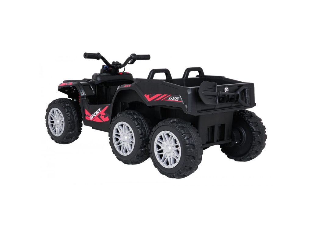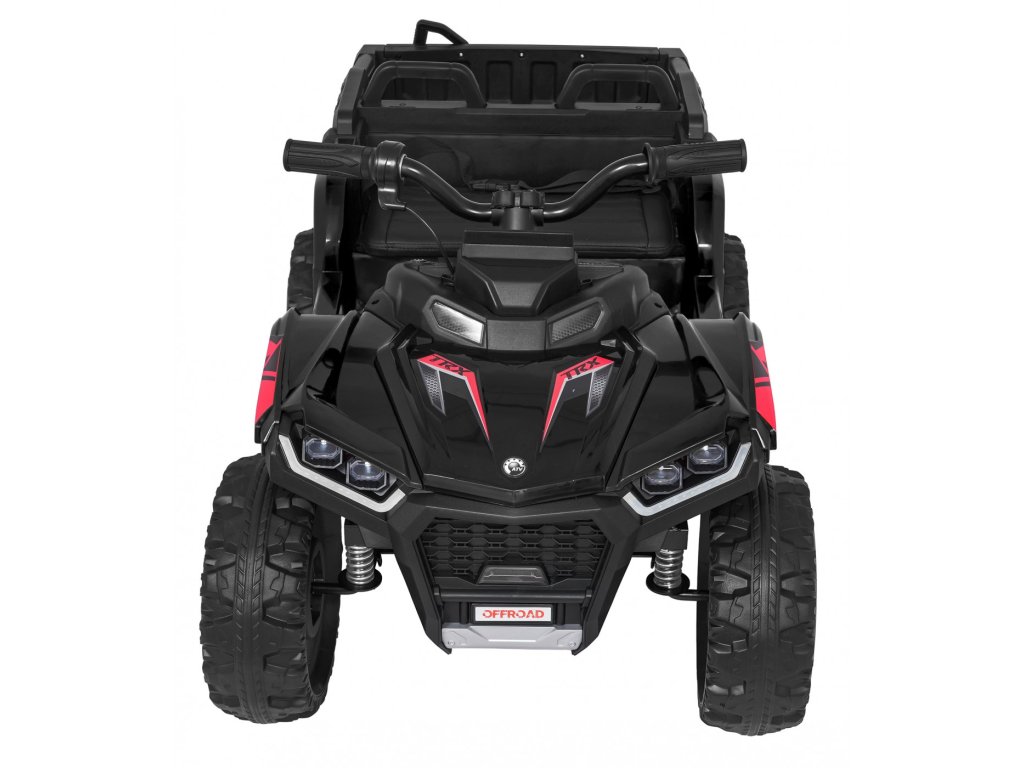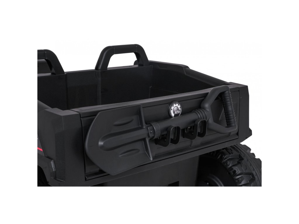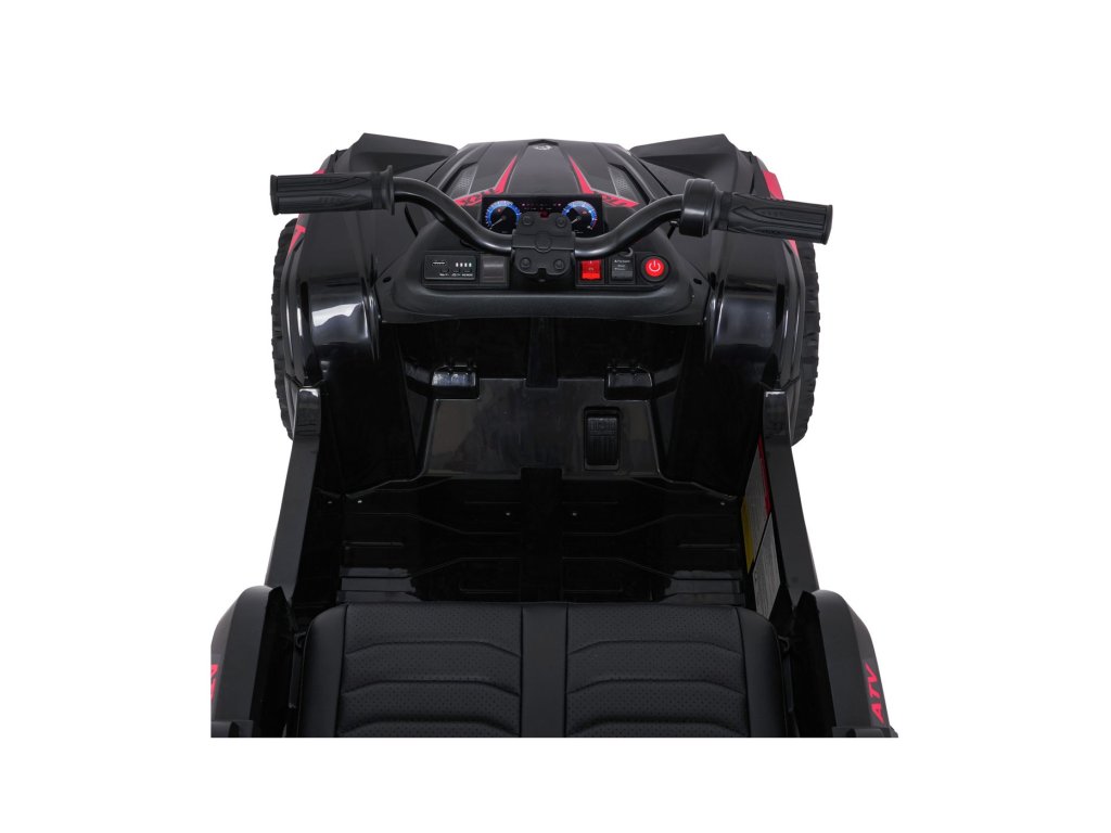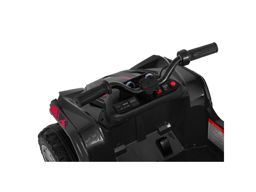 АТВ-то е оборудвано с безшумни EVA пянни гуми с размер 26 x 11 см и окачване отпред и отзад, което осигурява комфортно и стабилно каране дори по неравен терен. За безопасността на детето се грижат предпазните колани и здрава седалка от черна екокожа.