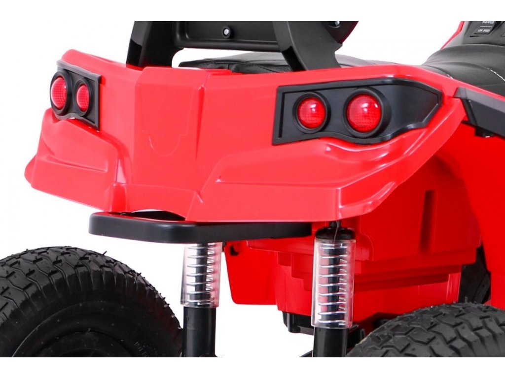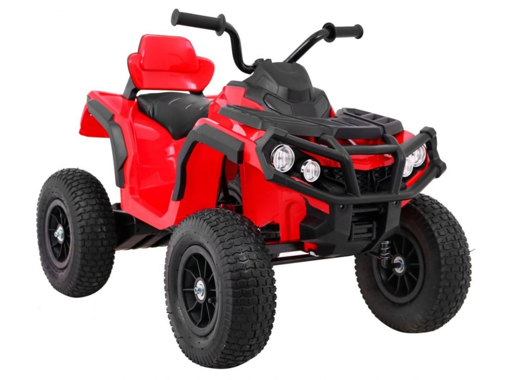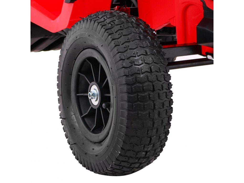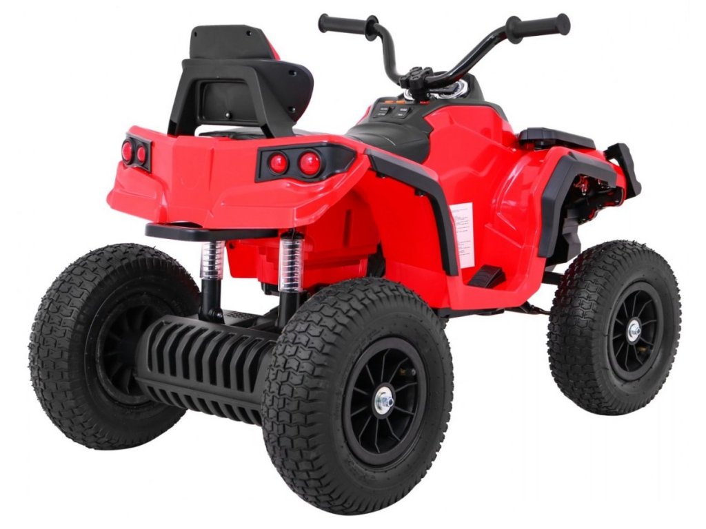 Детско акумулаторно атв с надуваеми гуми червено идва с мощен електрически мотор. Предназначено е за всички деца с максимално тегло до 30 кг. Надуваемите гумени колела се адаптират към различни терени и се справят дори с неравен път. Детето сяда на удобно оформено седалка от екологична кожа и осветява пътя напред и назад с LED светлини.