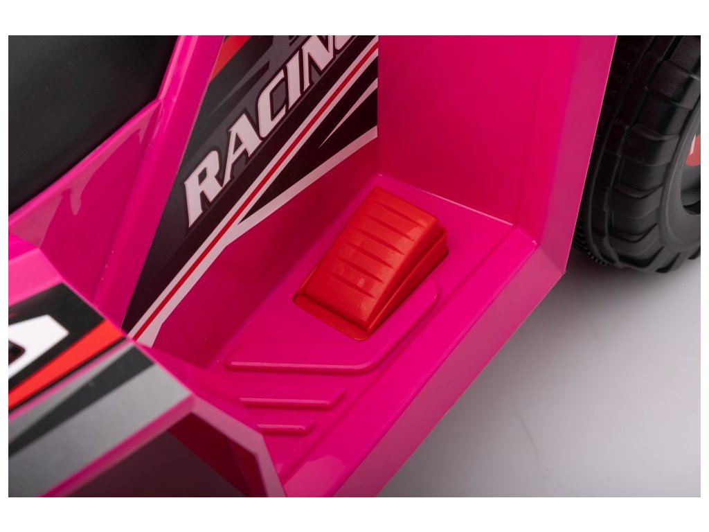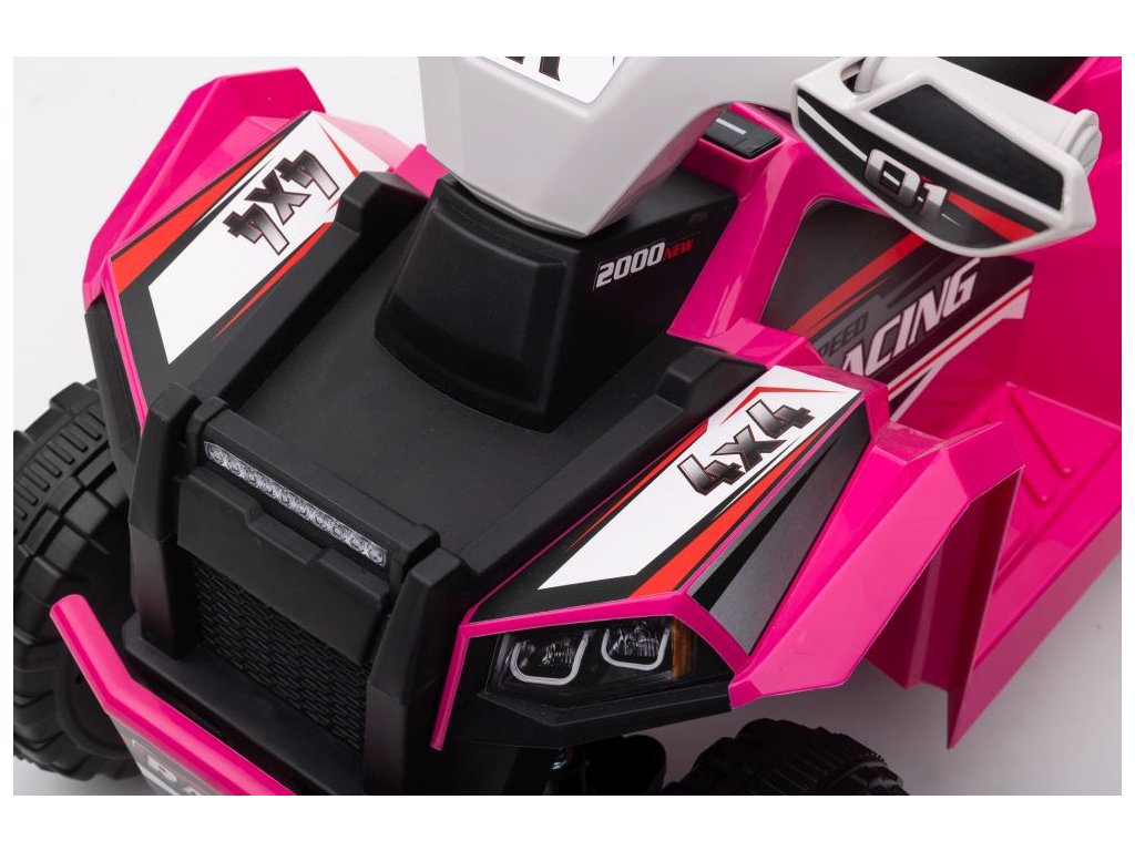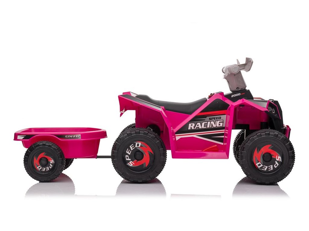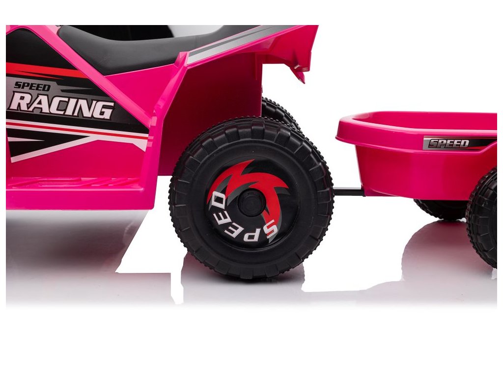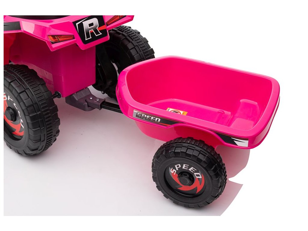 Детско акумулаторно атв с ремарке розово разполага с мотор с мощност 45W и широки пластмасови гуми. Атв-то е предназначено за каране на тревни площи или асфалт, като максималното му допустимо натоварване е до 30 кг.
