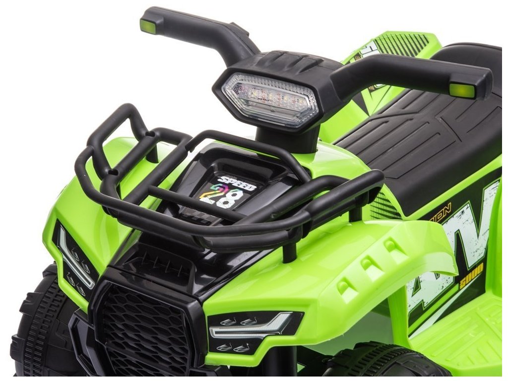 Детското акумулаторно атв е оборудвано с удобно оформено седалче, гумирани колела, предни LED светлини и музикален панел с входове за MP3 и USB.