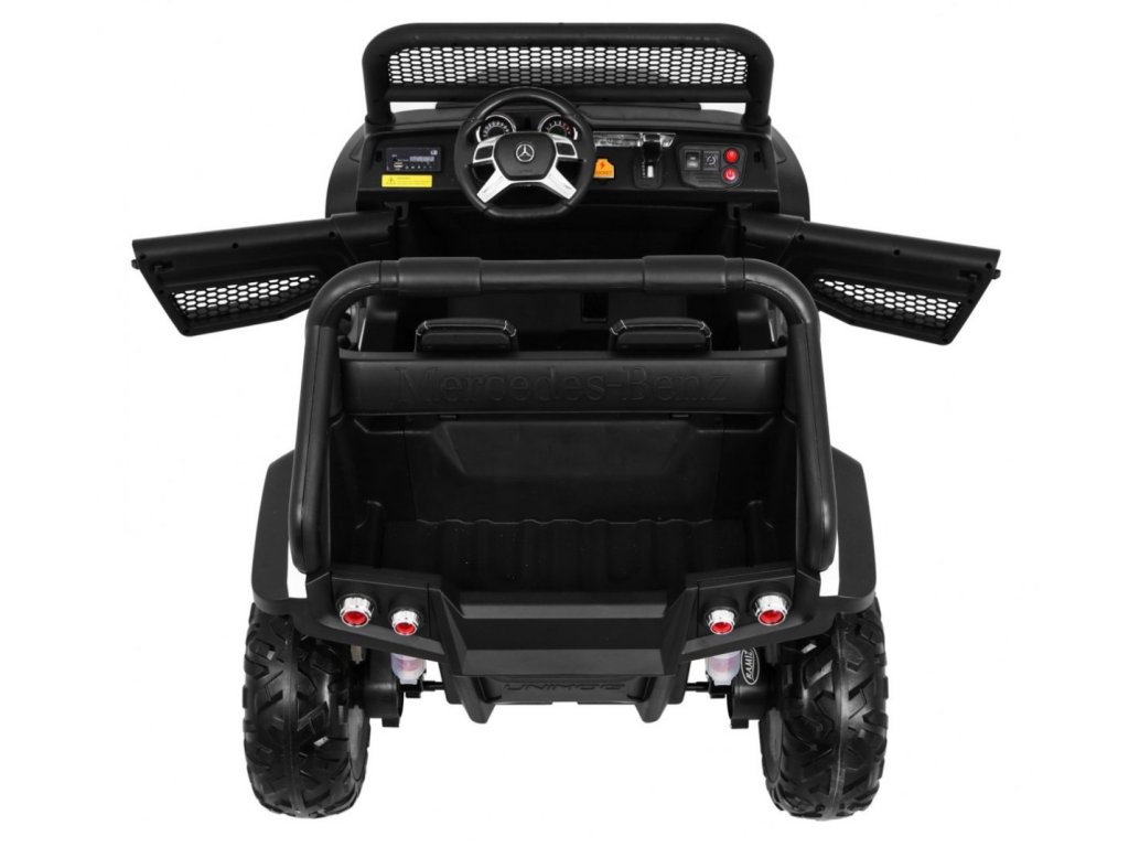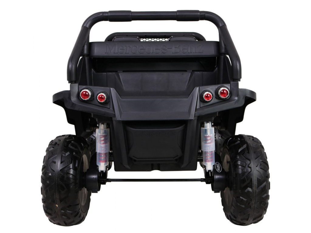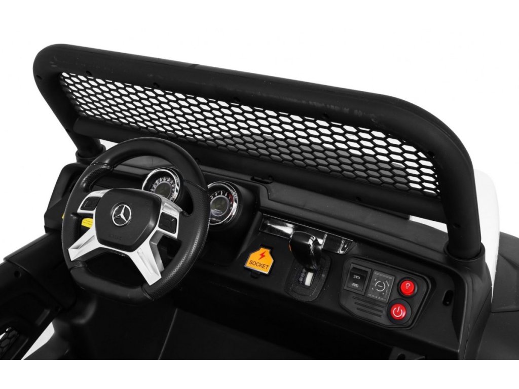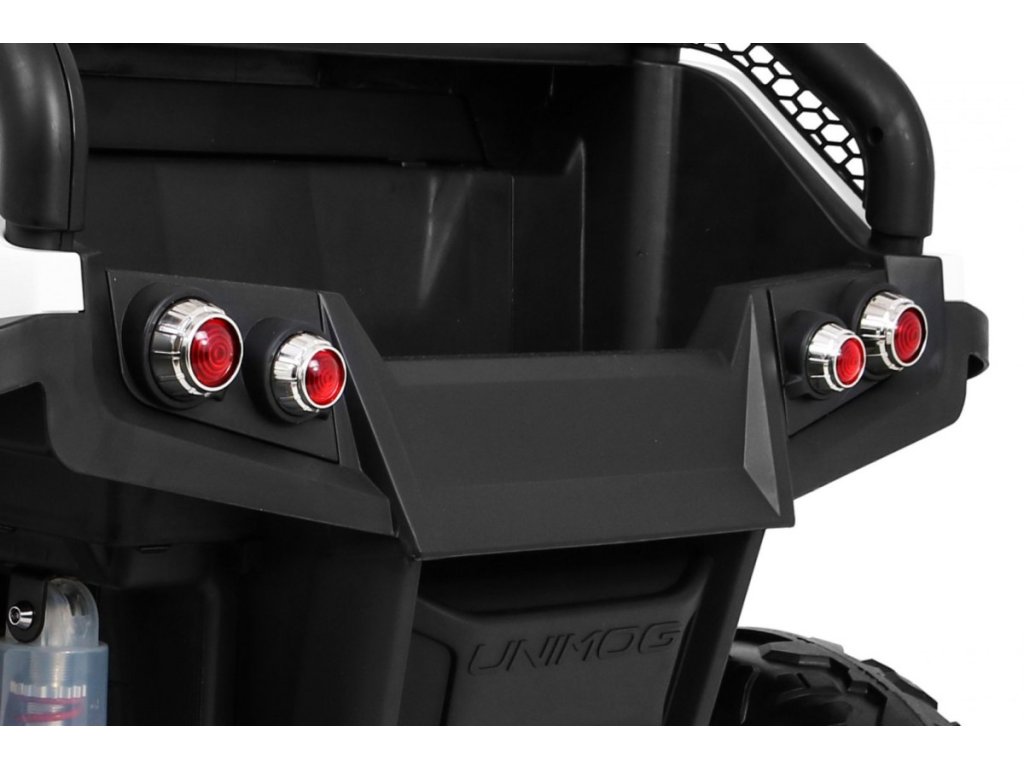 Детско акумулаторно бъги 4x4 Mercedes-Benz Unimog бяло е проектирано да се справя почти с всякакъв терен. Оборудвано е с четири мощни електрически двигателя и меки пянообразни Eva гуми, които осигуряват тиха и надеждна работа.