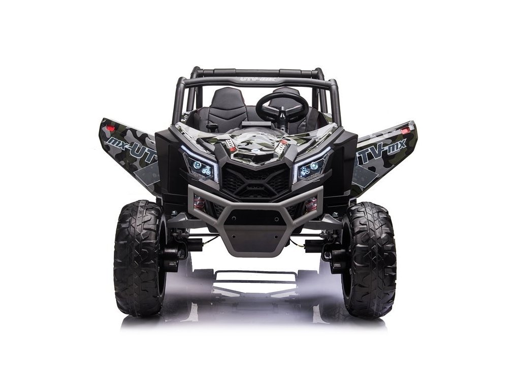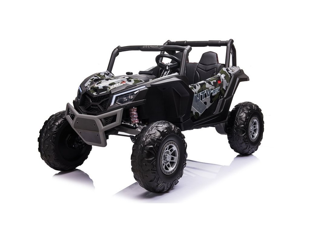 Детско акумулаторно бъги UTV-MX 4x4 LCD MP4 лакирано камуфлажно разполага с четири мощни електрически мотора с мощност 60W и широки колела от EVA пяна, благодарение на които безпроблемно преодолява различни терени. Максималното натоварване на бъгито е до 50 кг, което позволява да седнат две деца.