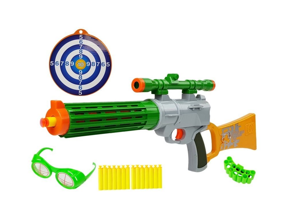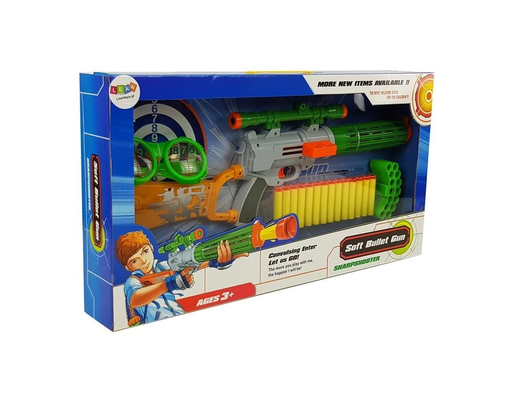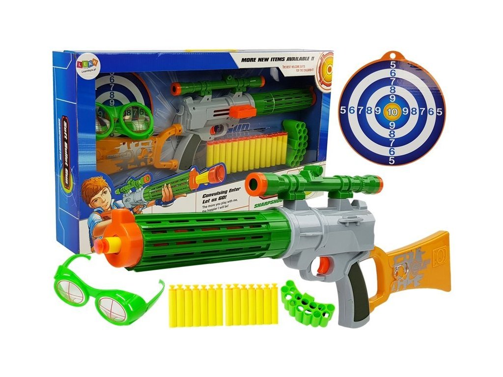 Детски автомат позволява безопасна игра, стрелящ с меки стрелички от пяна, изработени от сертифицирани материали. Дизайнът на играчката наподобява реално оръжие, но е напълно безопасен – без остри ръбове и опасни елементи.