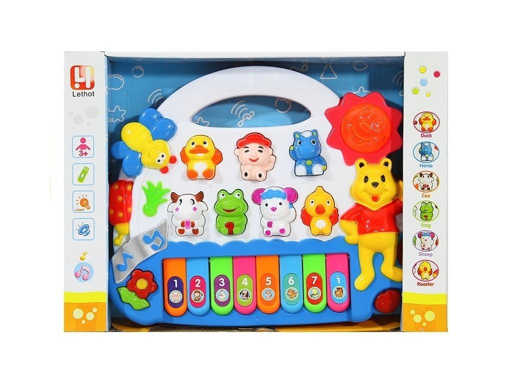 Ярко цветно пиано, което при натискане на съответното животинче издава звуци на: