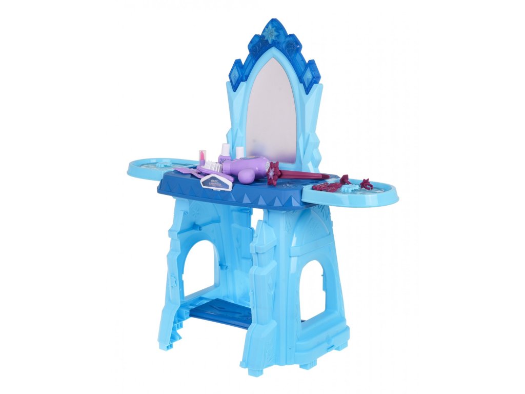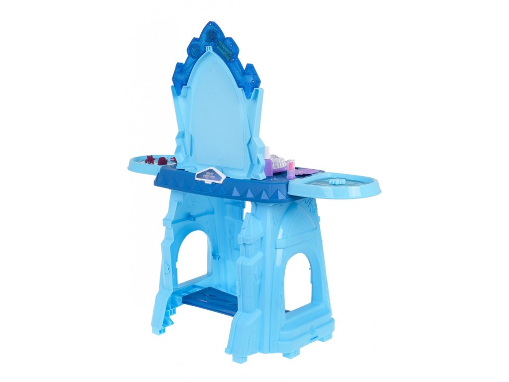 Интерактивно детско тоалетно бюро с аксесоари синьо със звукови и светлинни ефекти, подходящо за деца над 3 години. Комплектът включва тоалетно бюро с голямо огледало и реплики на козметика и бижута. Над огледалото има бутон под формата на звезда, който при натискане активира звукови и светлинни ефекти. Страничните рафтове могат да се отварят като капаци. Тоалетното бюро работи с 2 броя AAA батерии 1,5 V (не са включени в комплекта).