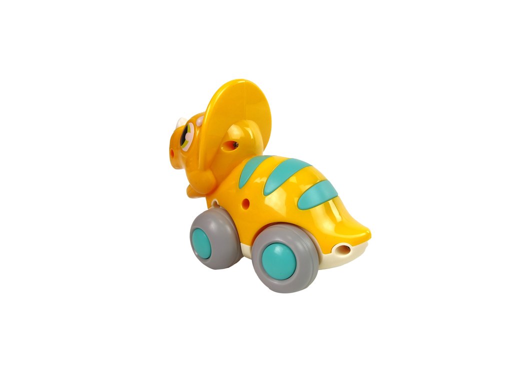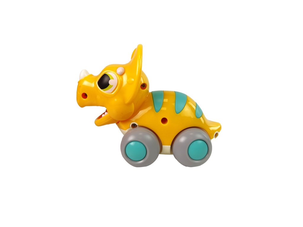 Динозавър на колелца Трицератопс жълт представлява симпатичен жълт динозавър с бяло коремче. Лесно се движи по равни повърхности и спира при среща с препятствия. По време на движението динозавърът отваря и затваря устата си.