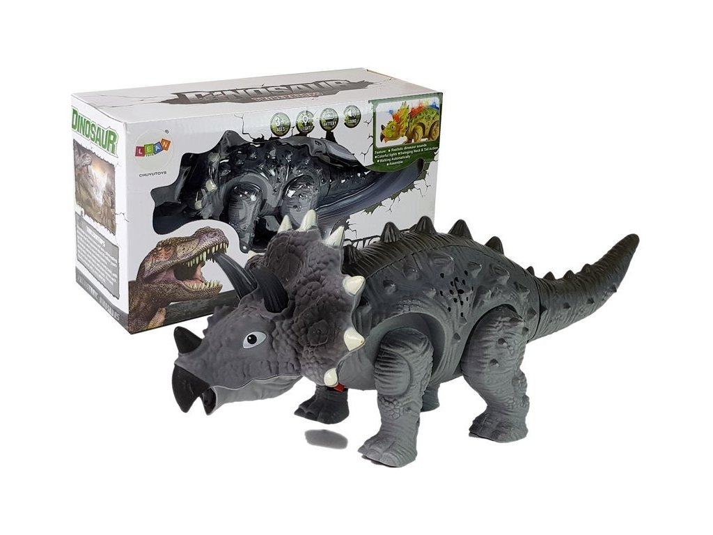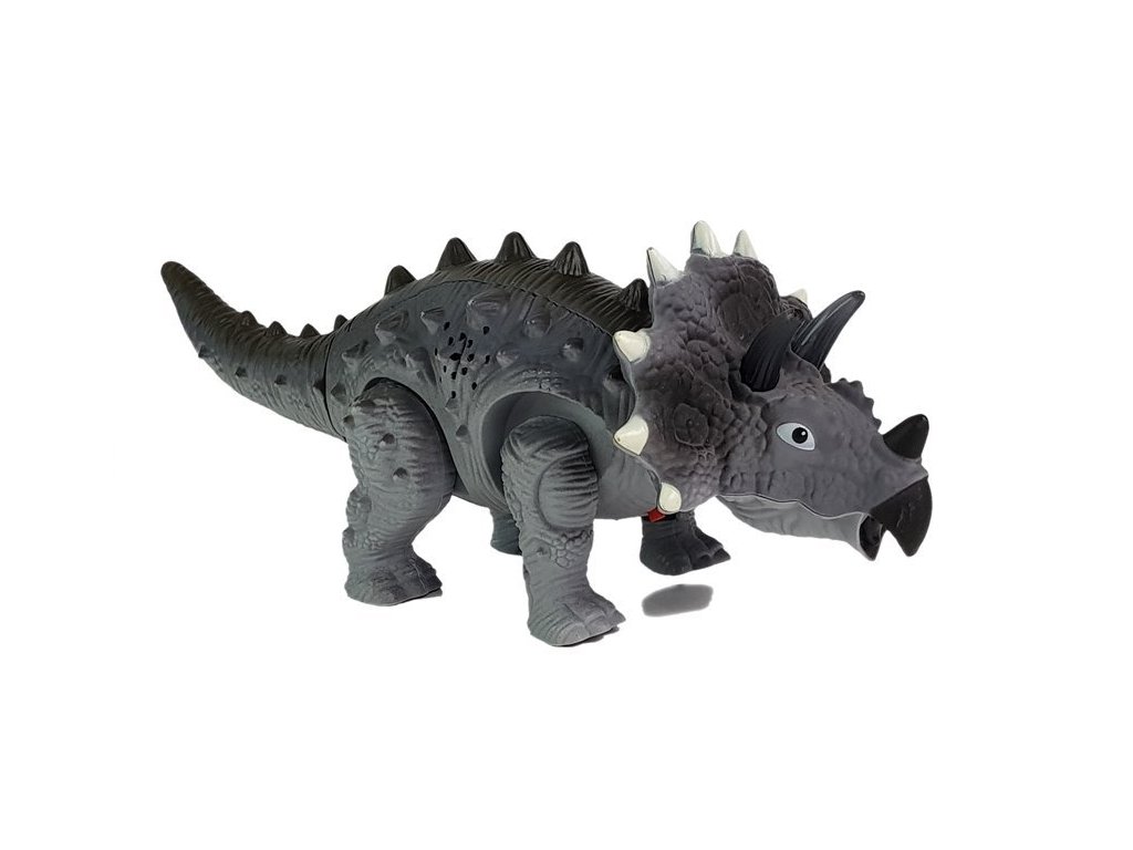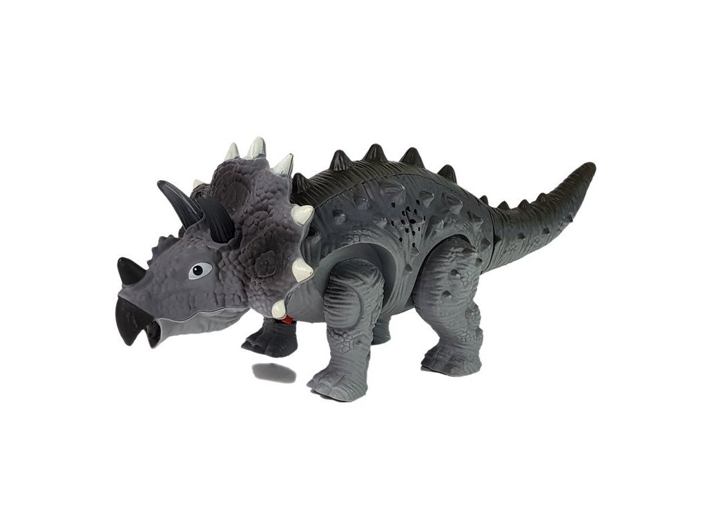 Динозавър Трицератопс на батерии сив е вдъхновен от животни, които са живели преди 125 милиона години. Разполага със светлинни ефекти, които се активират при включване на динозавъра, както и със звукови ефекти. Трицератопсът може да ходи, да движи врата си и опашката.