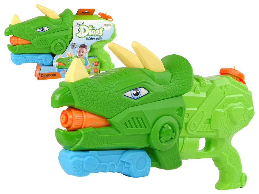 Воден пистолет във форма на динозавър ще зарадва всеки малък фен. Идеално предложение за басейна или на водата по време на ваканция. Децата ще се забавляват изключително, като безопасността е гарантирана максимално. Това е точно това! Организирането на стрелчески състезания или битки с такива уникални пистолети е истинско забавление. Играта ще бъде фантастично удоволствие за детето, тъй като позволява множество начини на игра – единственото ограничение е безопасността и въображението на малчугана. Пистолетът има гумен защитен накрайник, което го прави напълно безопасен за най-малките. Изтегляйки дръжката, водата от резервоара излита от устата на динозавъра. Резервоарът побира около 1330 мл вода. Оръжието е зелено и изглежда като динозавър от приказките.