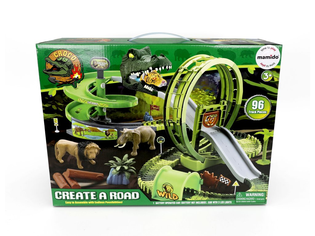 Приключение с адреналин в праисторическа пустош! Състезателна офроуд писта с голям лупинг и отваряща се глава на динозавър носи на децата безкрайно действие и креативно строене. Те сглобяват собствена писта, поставят палми, препятствия и след това просто наблюдават как колата се носи през челюстта на хищника. Пистата е гъвкава, променлива и може да бъде преустройвана по желание – прави участъци, завои, рампи, изкачвания и спускане в устата на динозавър.