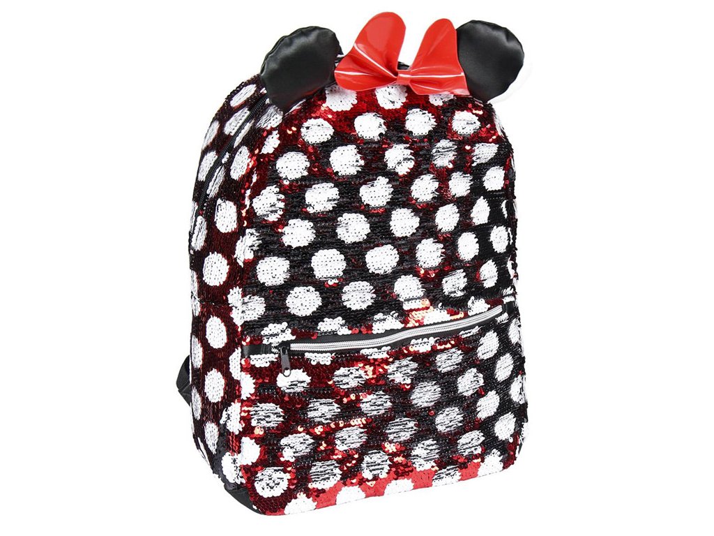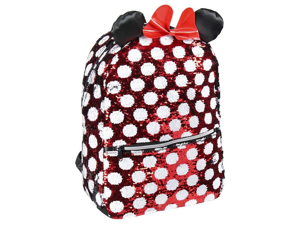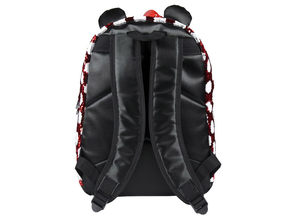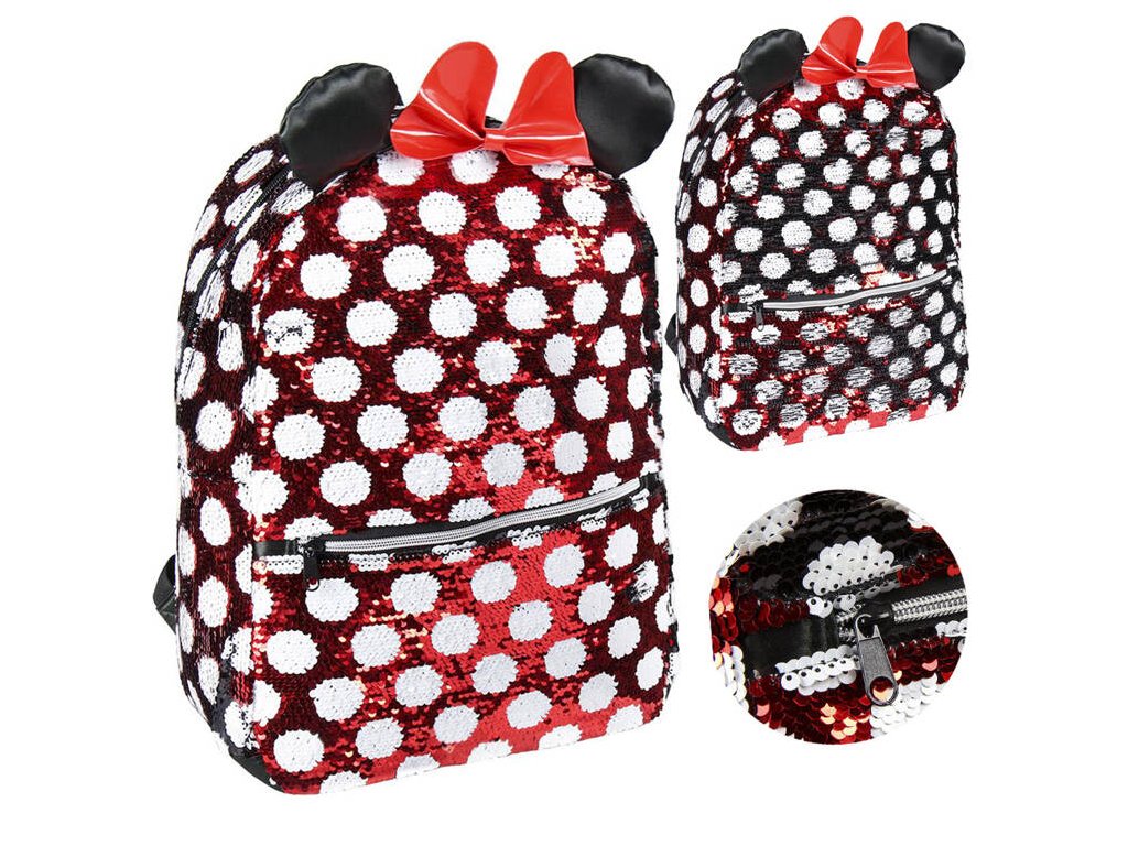 Оригинален дизайн: Раницата притежава характерен дизайн с Мини Маус в червено и бяло, допълнен с нежна червена панделка и лъскави уши.