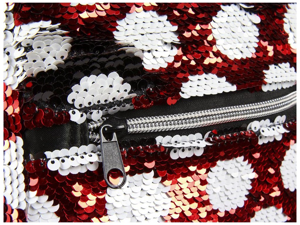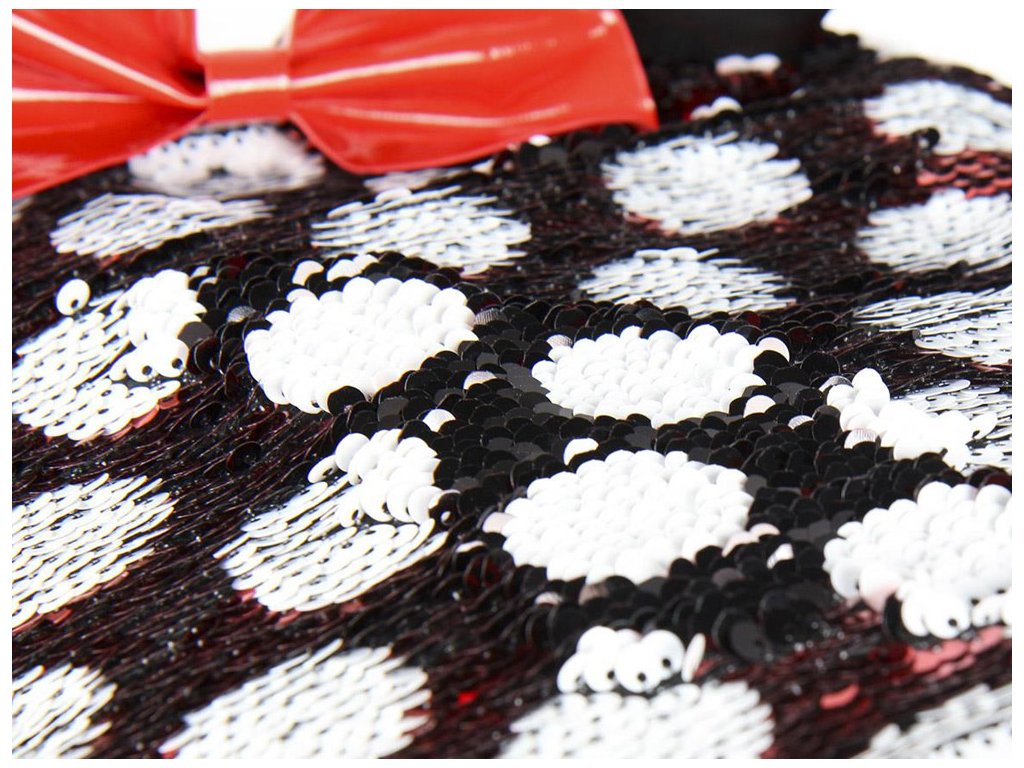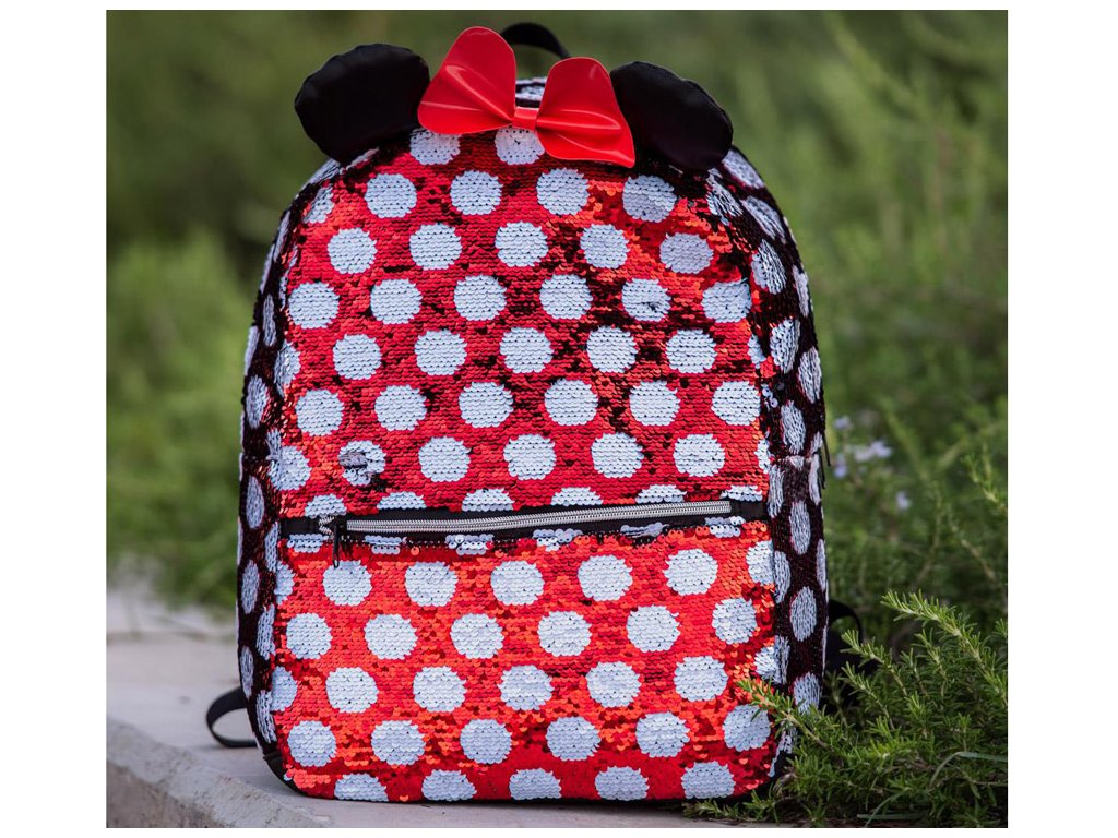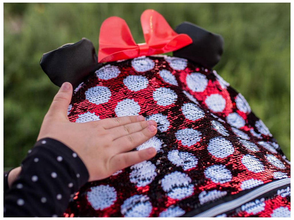 Оригинален дизайн: Раницата притежава характерен дизайн с Мини Маус в червено и бяло, допълнен с нежна червена панделка и лъскави уши.