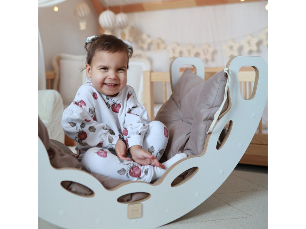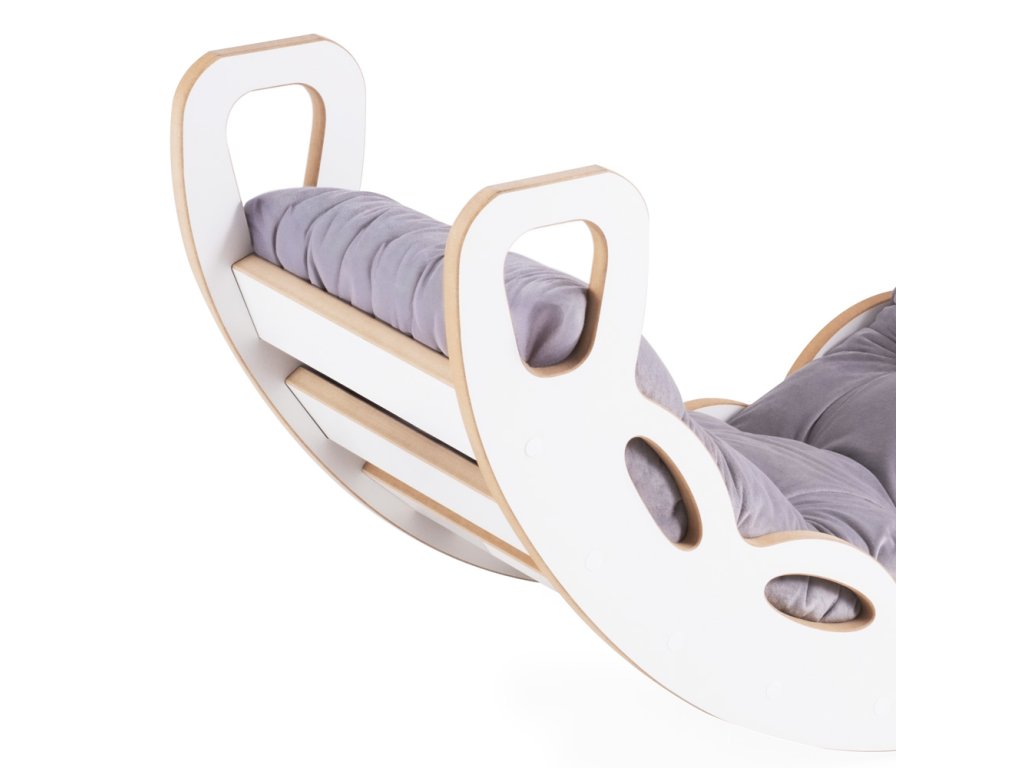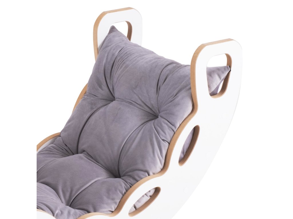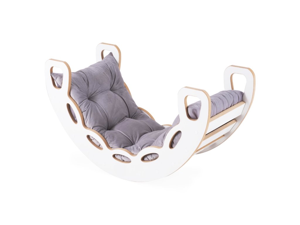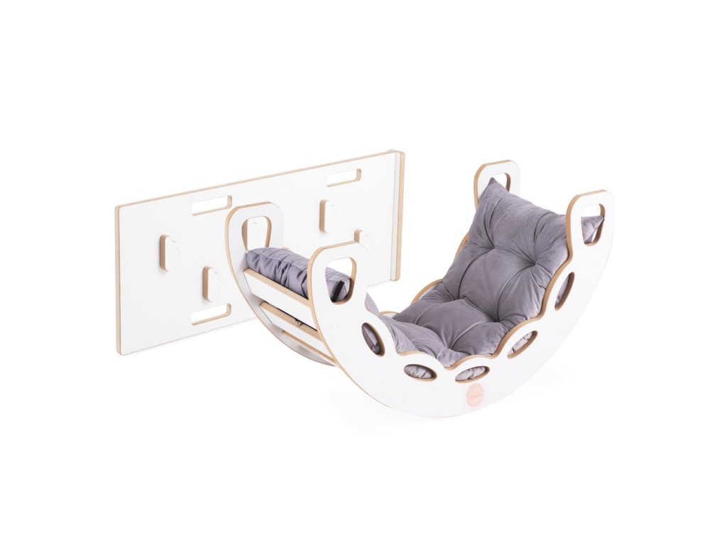 Дървена люлка Мини 4в1 със стена за катерене и пързалка + възглавница (кадифено сива), бяла дървена конструкция
