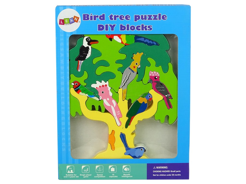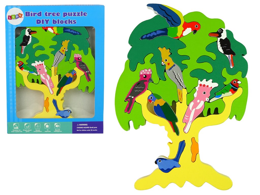 Дървен конструктор дърво с папагали под формата на пъзел спомага за развитието на фината моторика, търпението и координацията око-ръка. Дървените блокчета имат дебелина 2 см, което позволява компактно сглобяване както вертикално, така и хоризонтално.