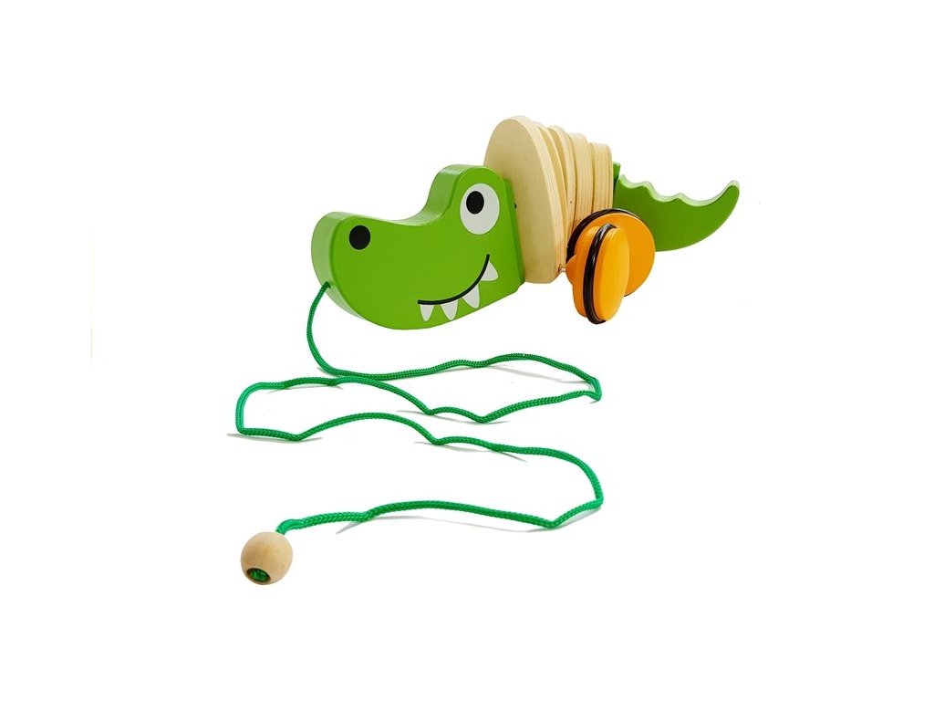 Очарователният, усмихнат дървен крокодил на колела 18см ще следва вашето дете навсякъде, просто държете връвчицата. Играчката с колелца за дърпане е отличен избор за деца от най-ранна възраст.