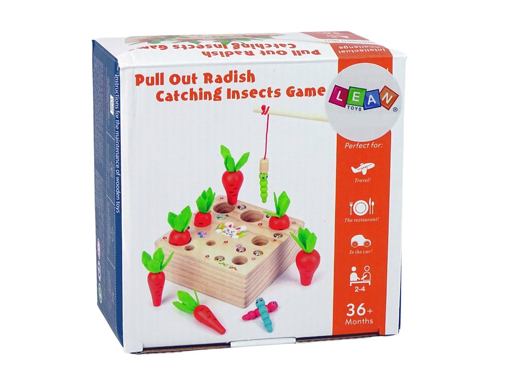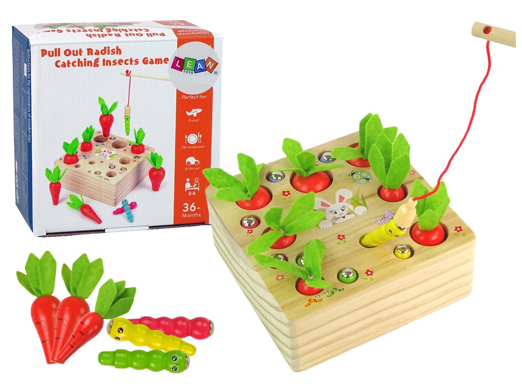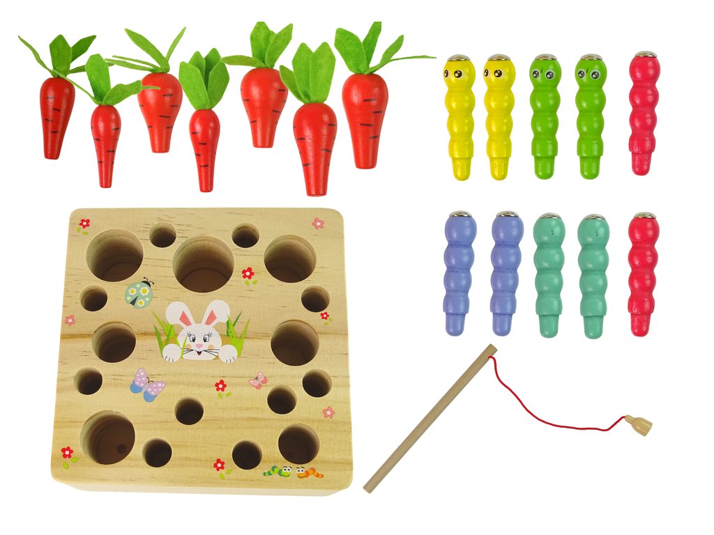Дървена игра за изваждане на червеи с въдица е забавна игра, която ще зарадва цялото семейство. Всяка морковка е с различен размер и форма и трябва да се постави така, че да пасне на отвора в основата.