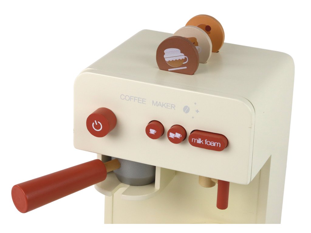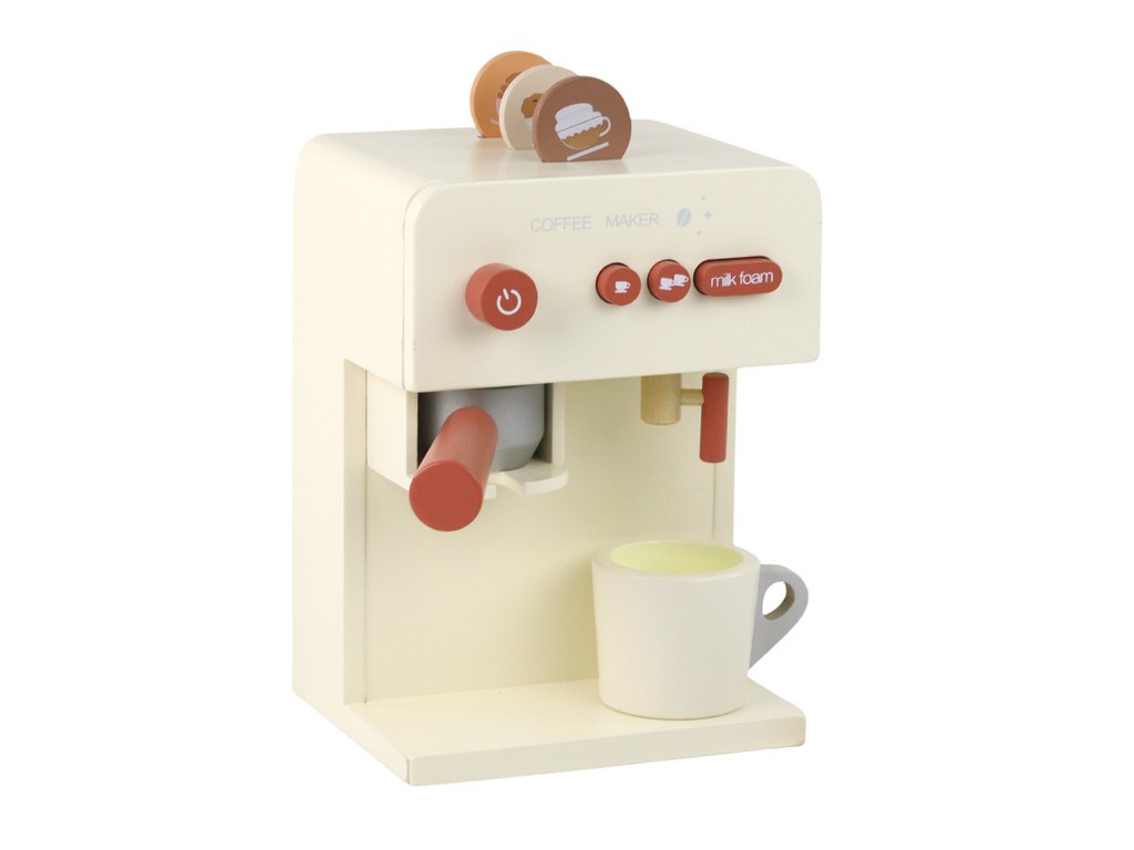 Тази дървена кафемашина за деца с чашка е прецизно копие на истинска кафемашина, което позволява на децата да изпитат удоволствието да бъдат бариста. Автентичността е гарантирана от детайли като кафявите бутони.