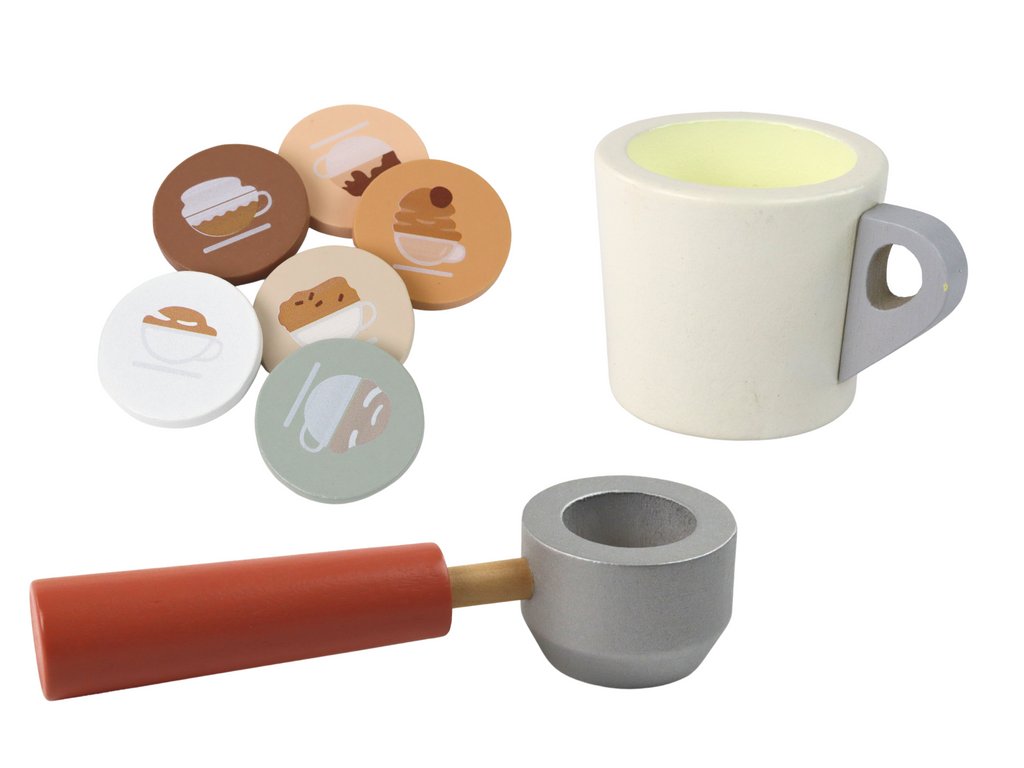 Дървената кафемашина се доставя с комплект дървени аксесоари, включително чашка, кафеена каничка и 6 капсули с имитация на кафе. Така децата имат възможност за креативна и творческа игра, като създават свои собствени кафе-сценарии.