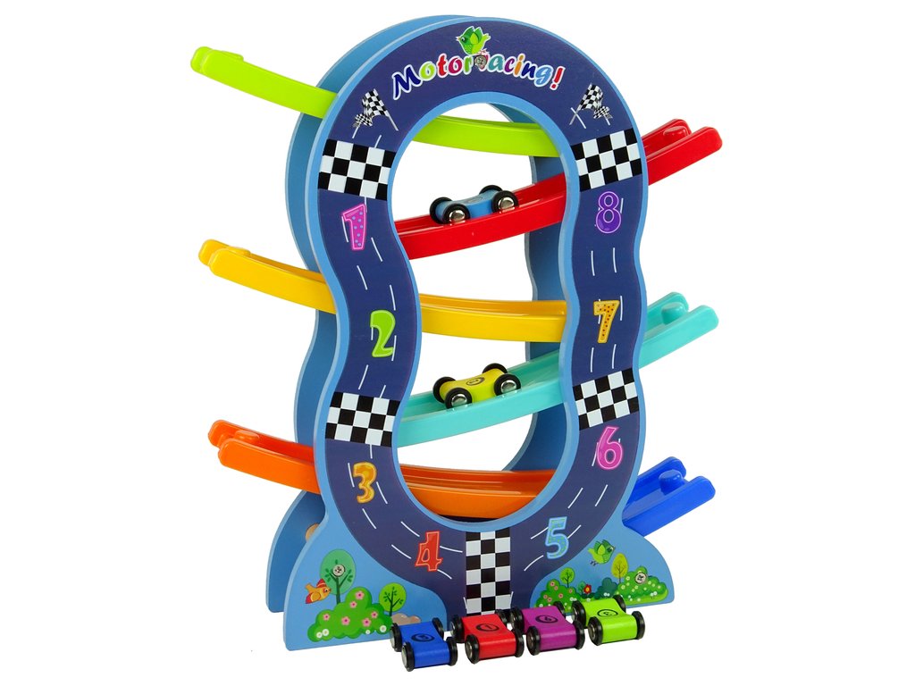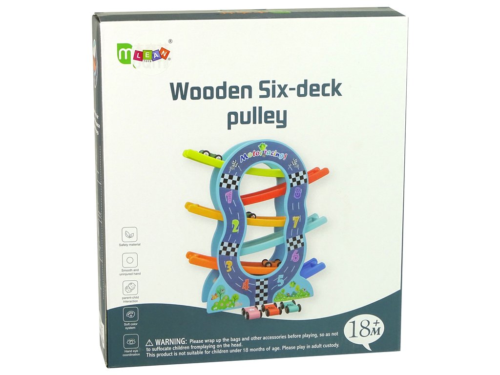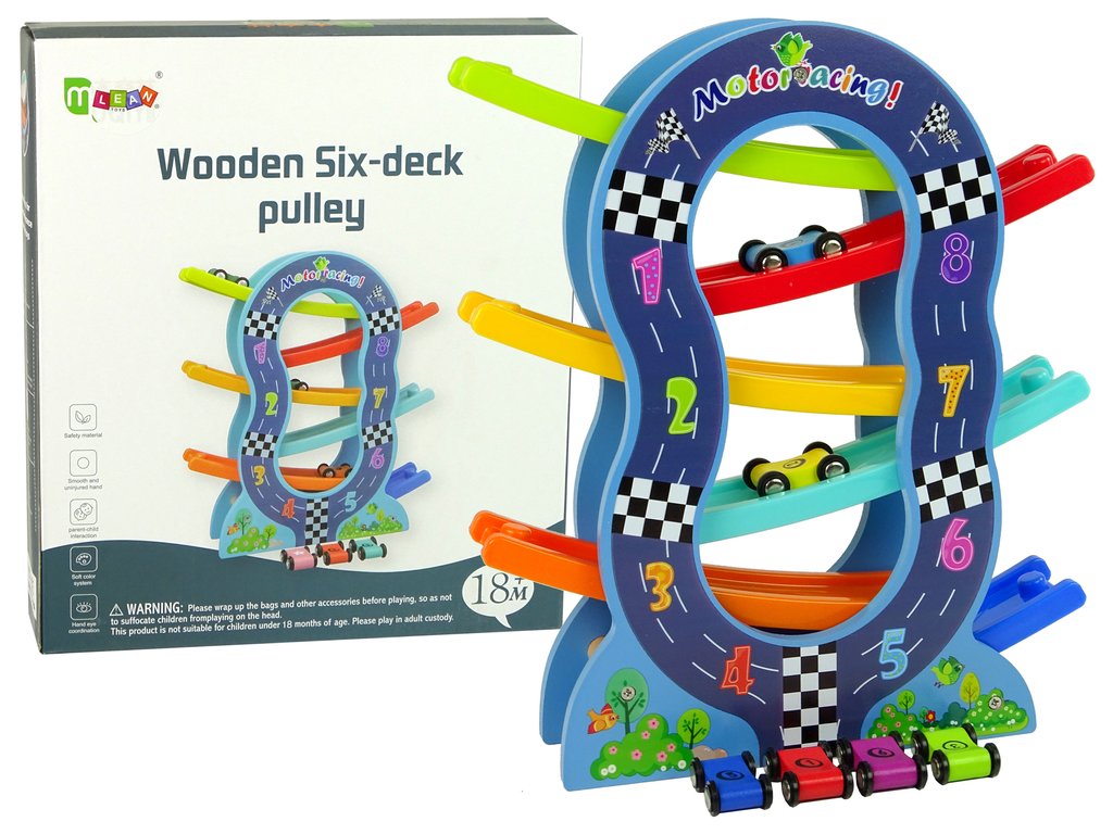Дървена писта с цифри и 6 колички се състои от шест нива, като всяко е с различен цвят. Пистата е маркирана с числа от 1 до 8, което позволява на детето да се запознае с формите и номерата, като започне първия си контакт с цифрите. Дървените колички също са номерирани, а комплектът включва 6 броя.