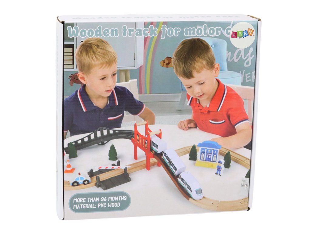 Дървената железопътна писта е отлична играчка, която пренася децата в свят на железопътни приключения и стимулира тяхното въображение. Този комплект, създаден специално за най-малките, съдържа всичко необходимо за създаване на приказен железопътен пейзаж.