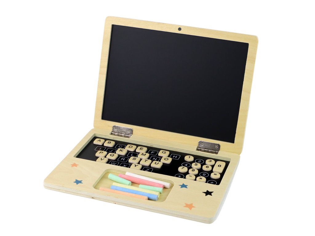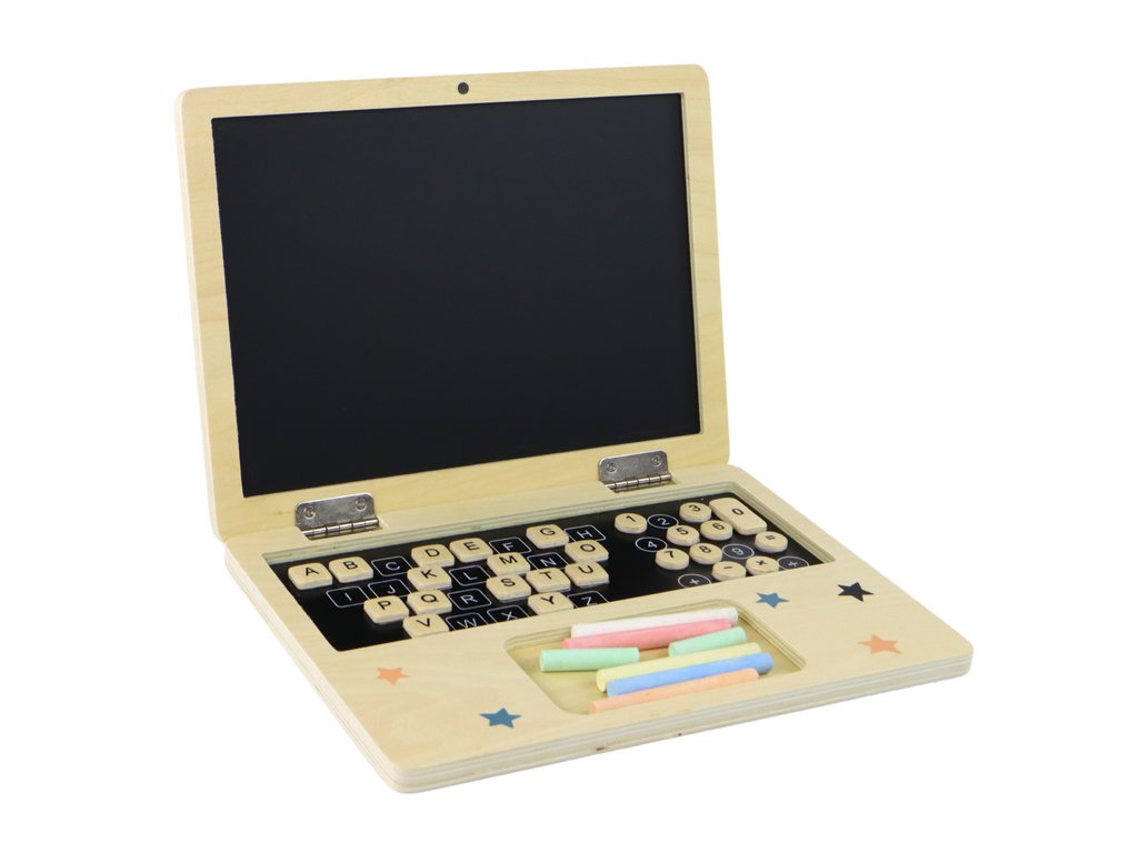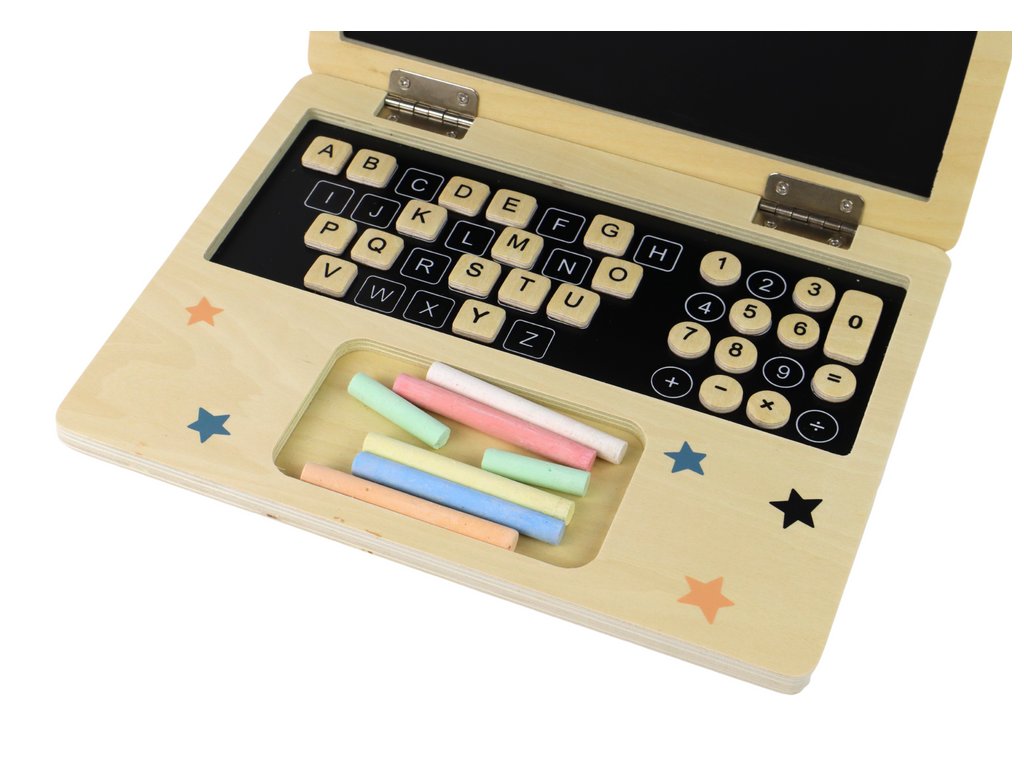 Вместо традиционна клавиатура, играчката разполага с дървени кубчета, които могат да се поставят на съответните места на клавиатурата. Това е необичаен метод за учене на съставяне на букви и развитие на фината моторика.